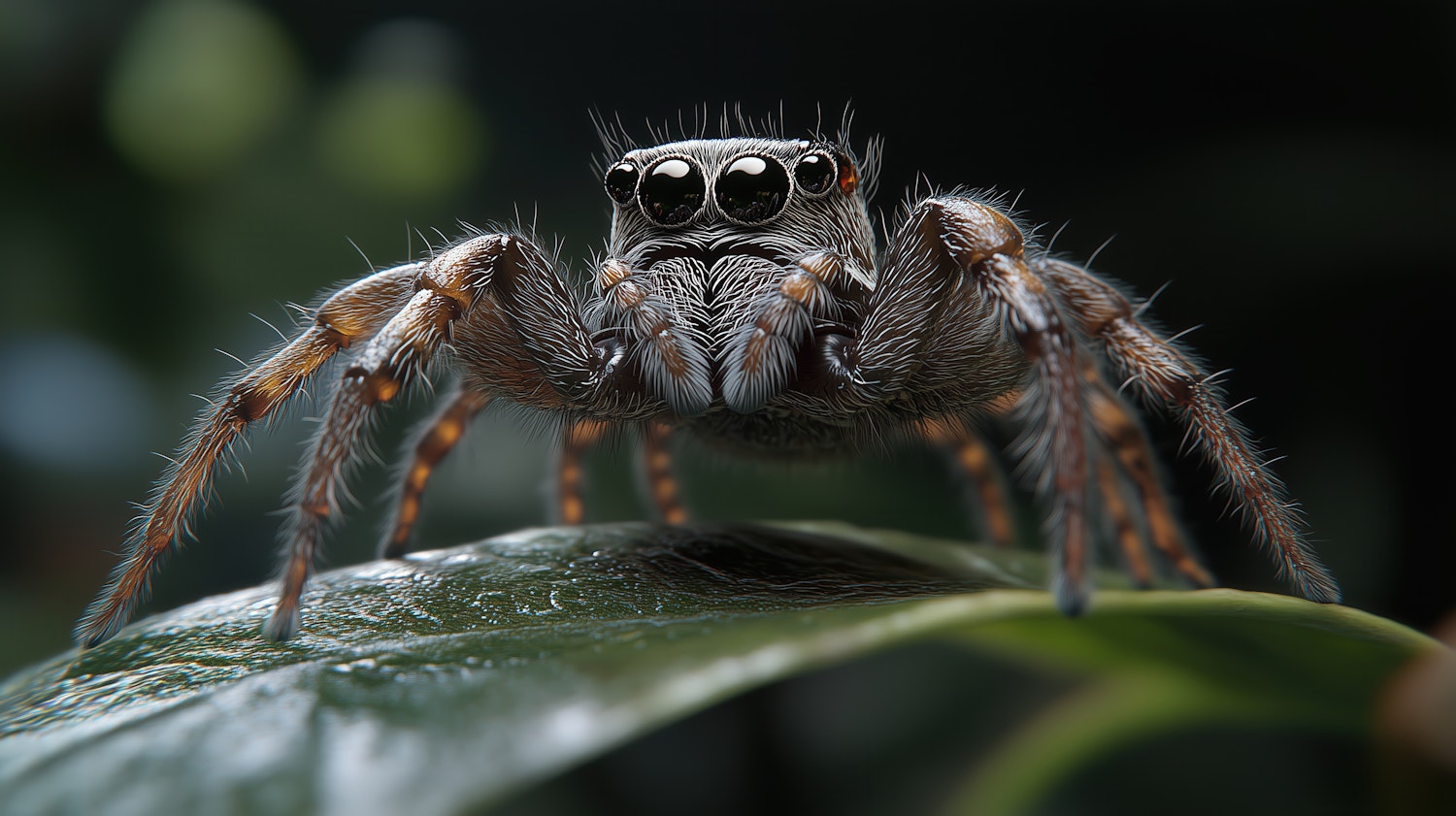 Close-up of a jumping spider with detailed hairs and glossy black eyes, perched on a green leaf against a softly blurred background.
