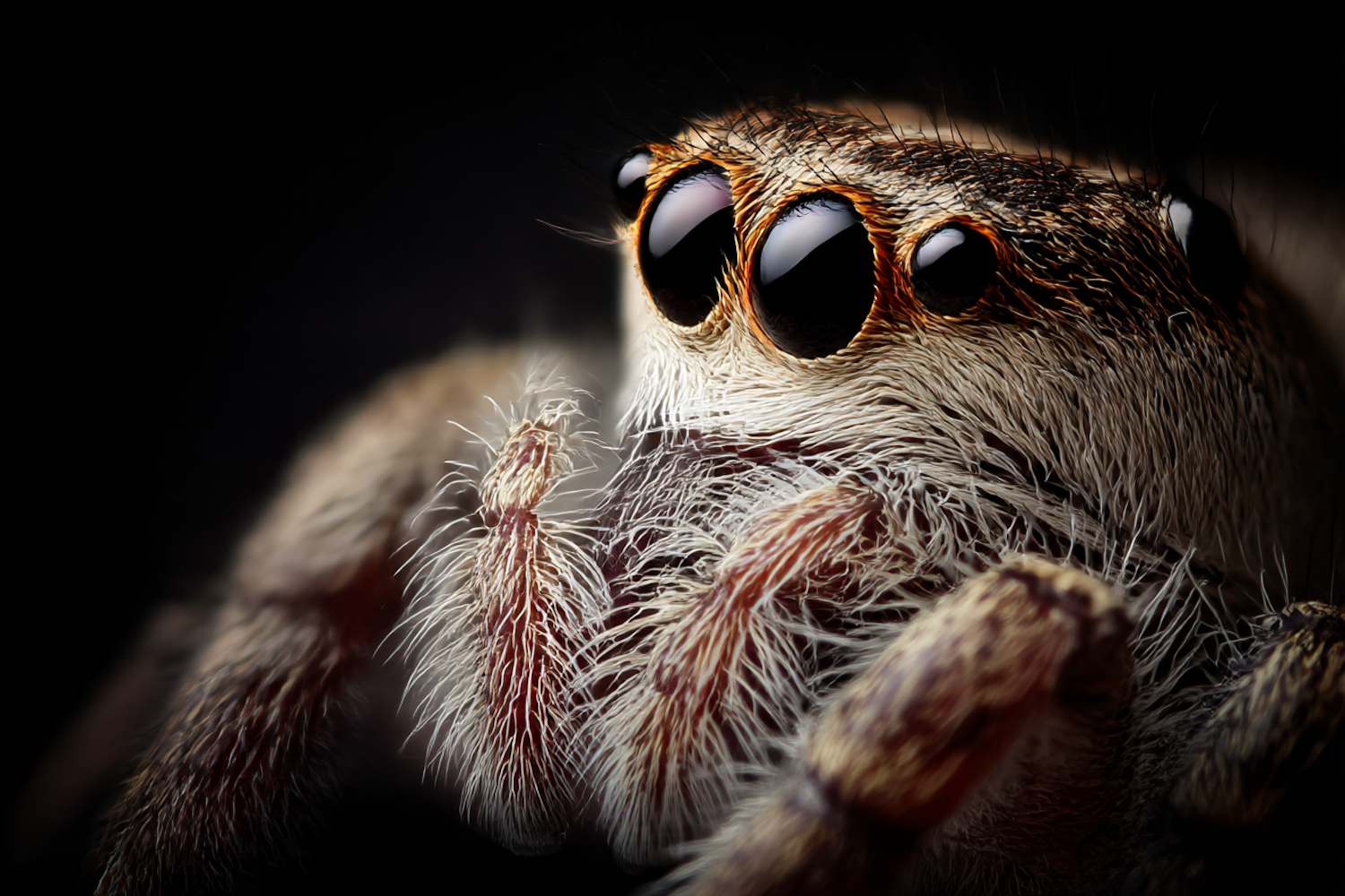 Macro shot of a jumping spider with detailed focus on its eyes and hairy body, set against a dark background for dramatic effect.