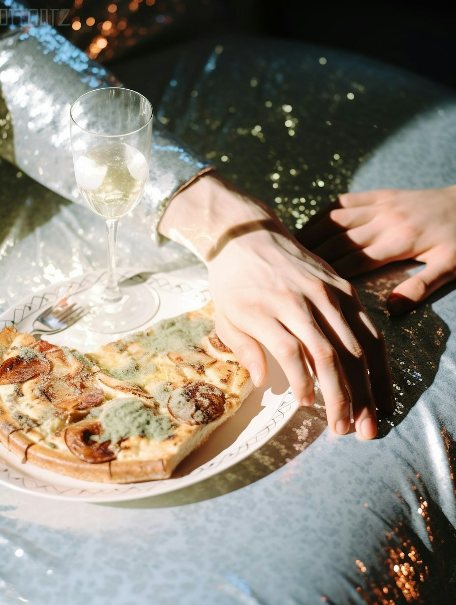 A hand on a sequined surface with a moldy pizza slice and a glass of wine, blending elegance with decay.