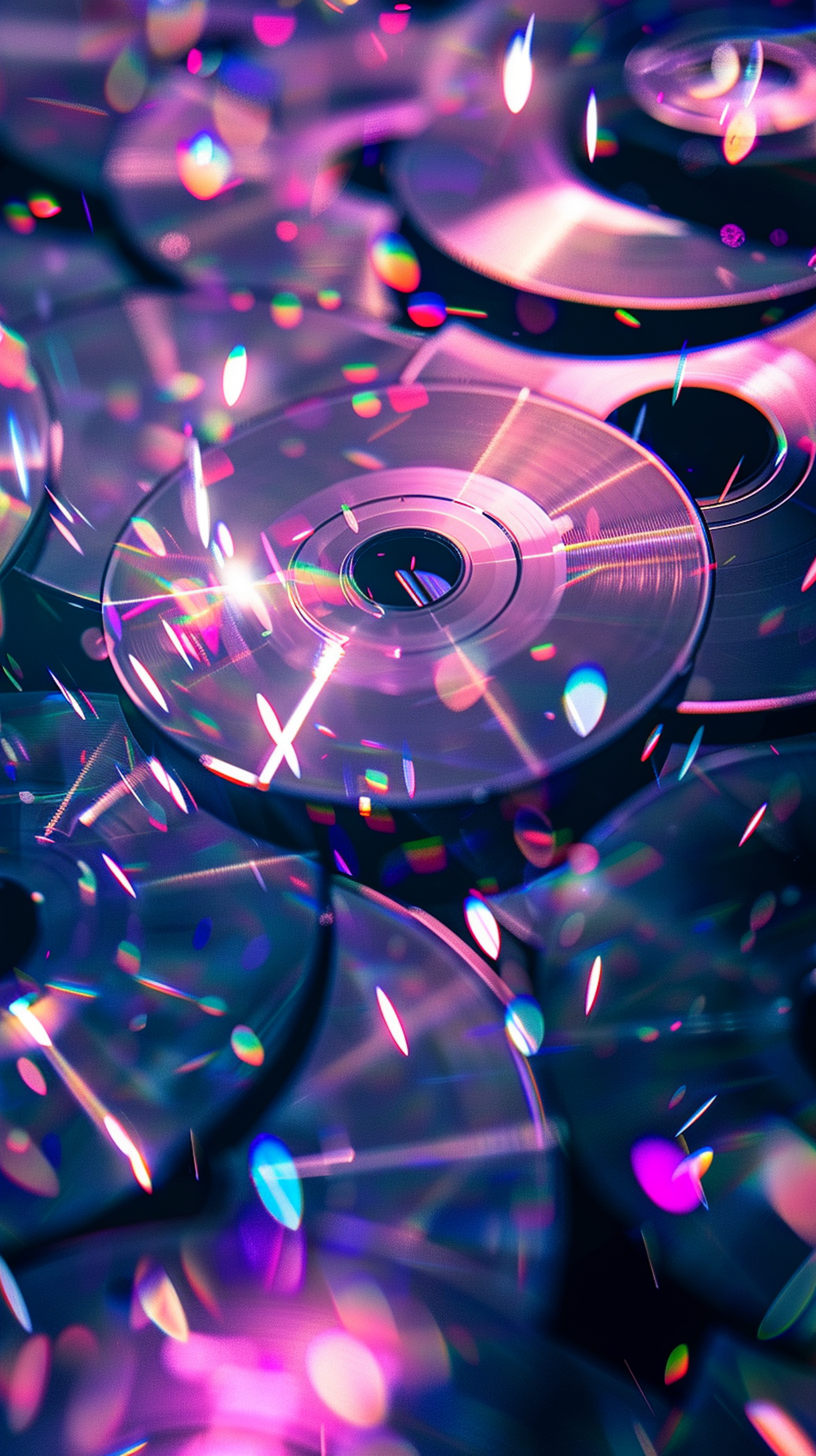 Colorful CDs reflecting vibrant lights, creating a dazzling kaleidoscope effect with pinks, purples, and blues.