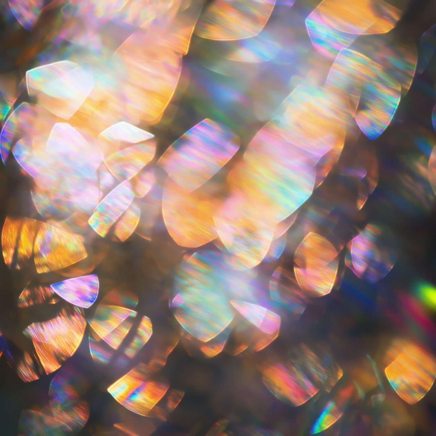 Abstract light refractions with vibrant orange, pink, and blue hues creating a dreamy, prismatic bokeh effect.