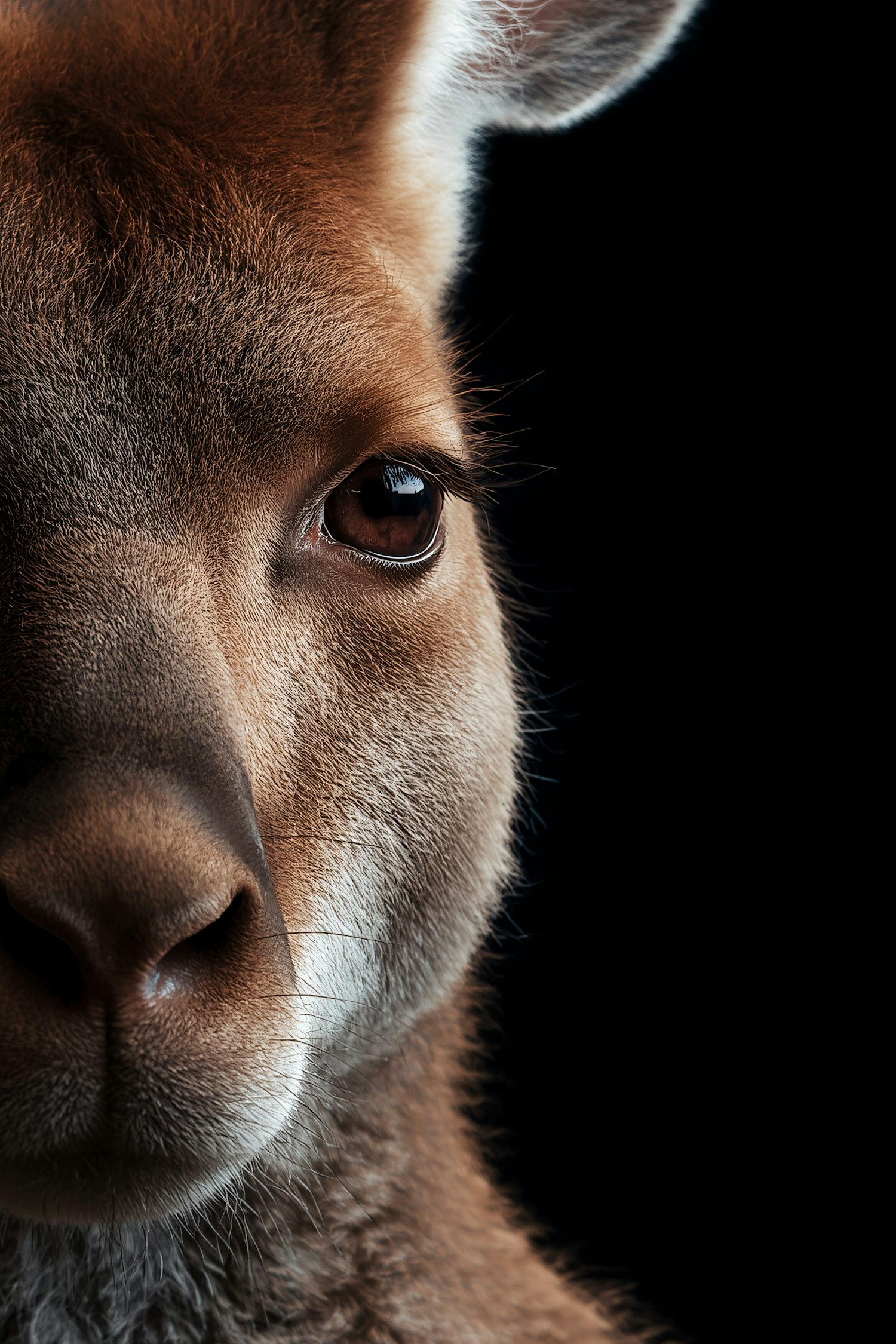 Close-up of a kangaroo's face with detailed fur texture and a black background, emphasizing its eye and nose.