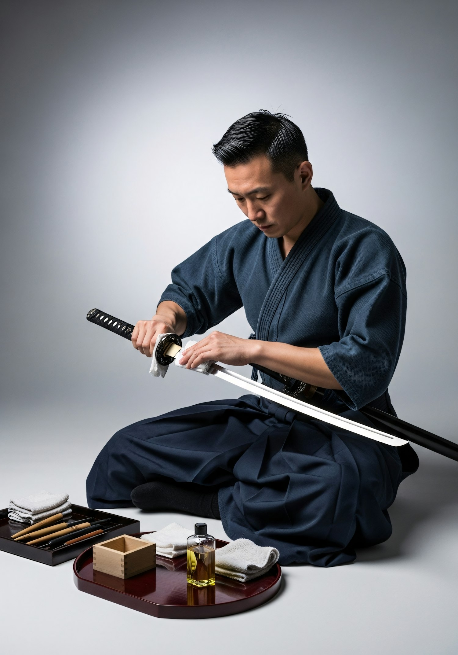 A man in traditional attire carefully cleans a katana sword, with tools and oil arranged neatly in front of him, showcasing precision and tradition.