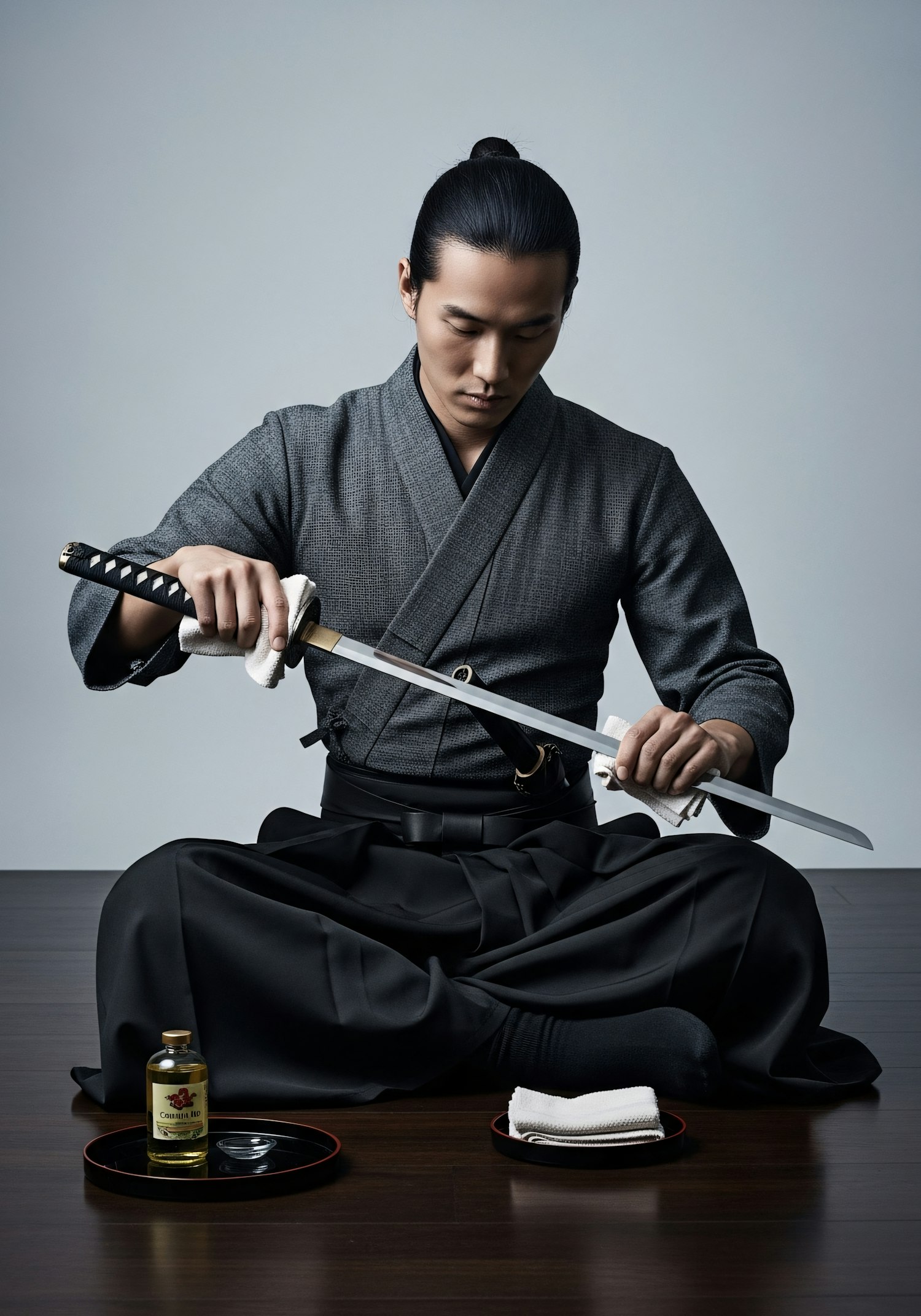 A person in traditional Japanese attire carefully cleans a katana sword, surrounded by tools for maintenance, on a wooden floor.