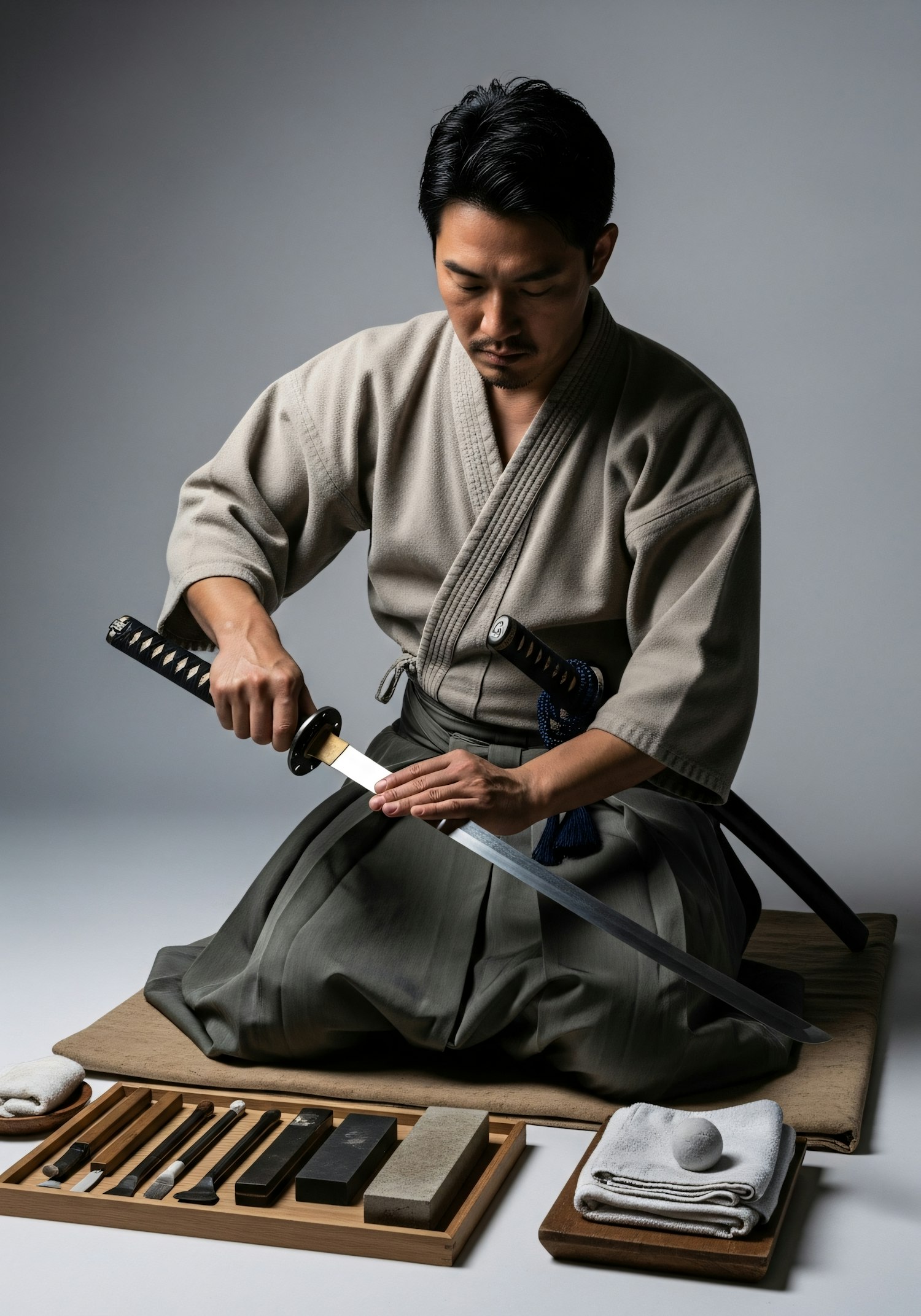 A man in traditional Japanese attire polishes a katana blade with precision, surrounded by tools for sword maintenance.