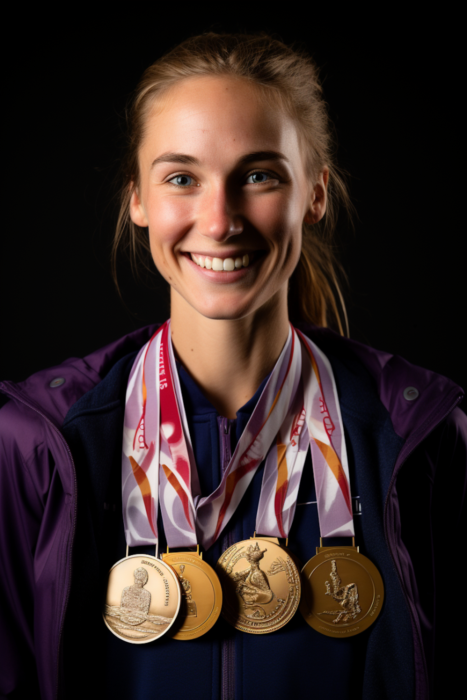 Young woman with gold medals, smiling confidently against a dark background, showcasing achievement and pride.