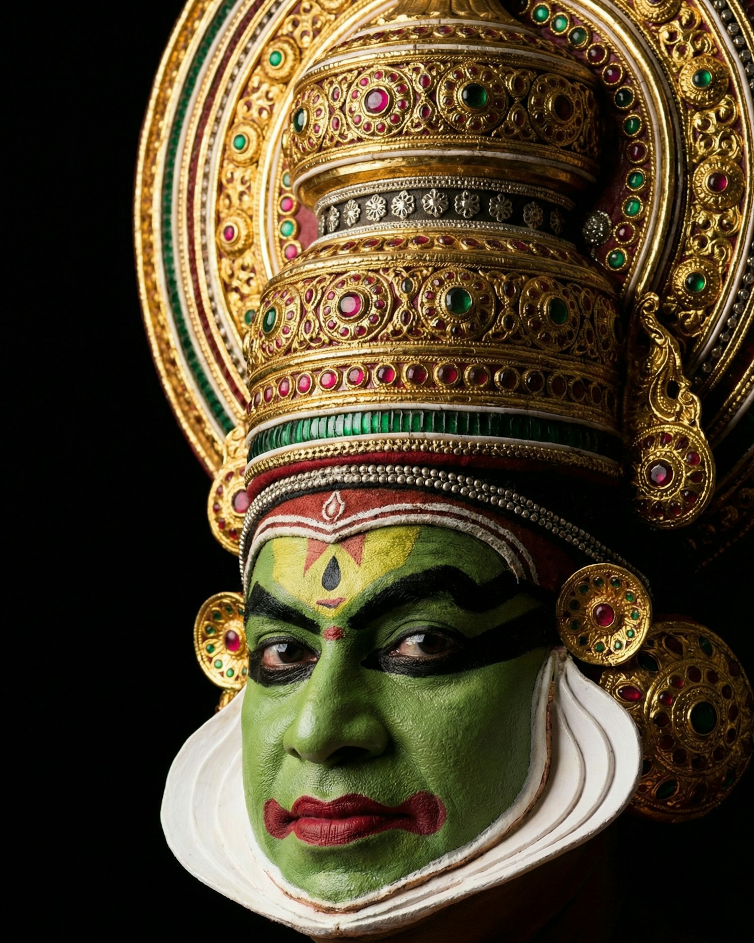 A vibrant close-up of a Kathakali performer with intricate makeup and an ornate headdress, showcasing traditional Indian art.