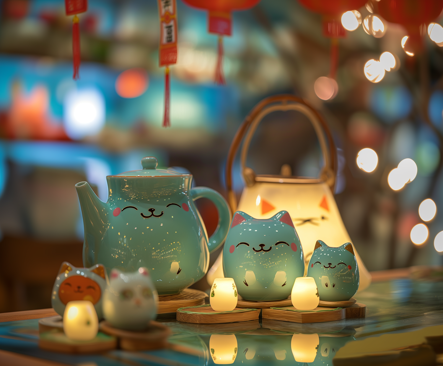 Charming cat-themed ceramics with smiling faces on a reflective surface, surrounded by warm bokeh lights and hanging decorations.