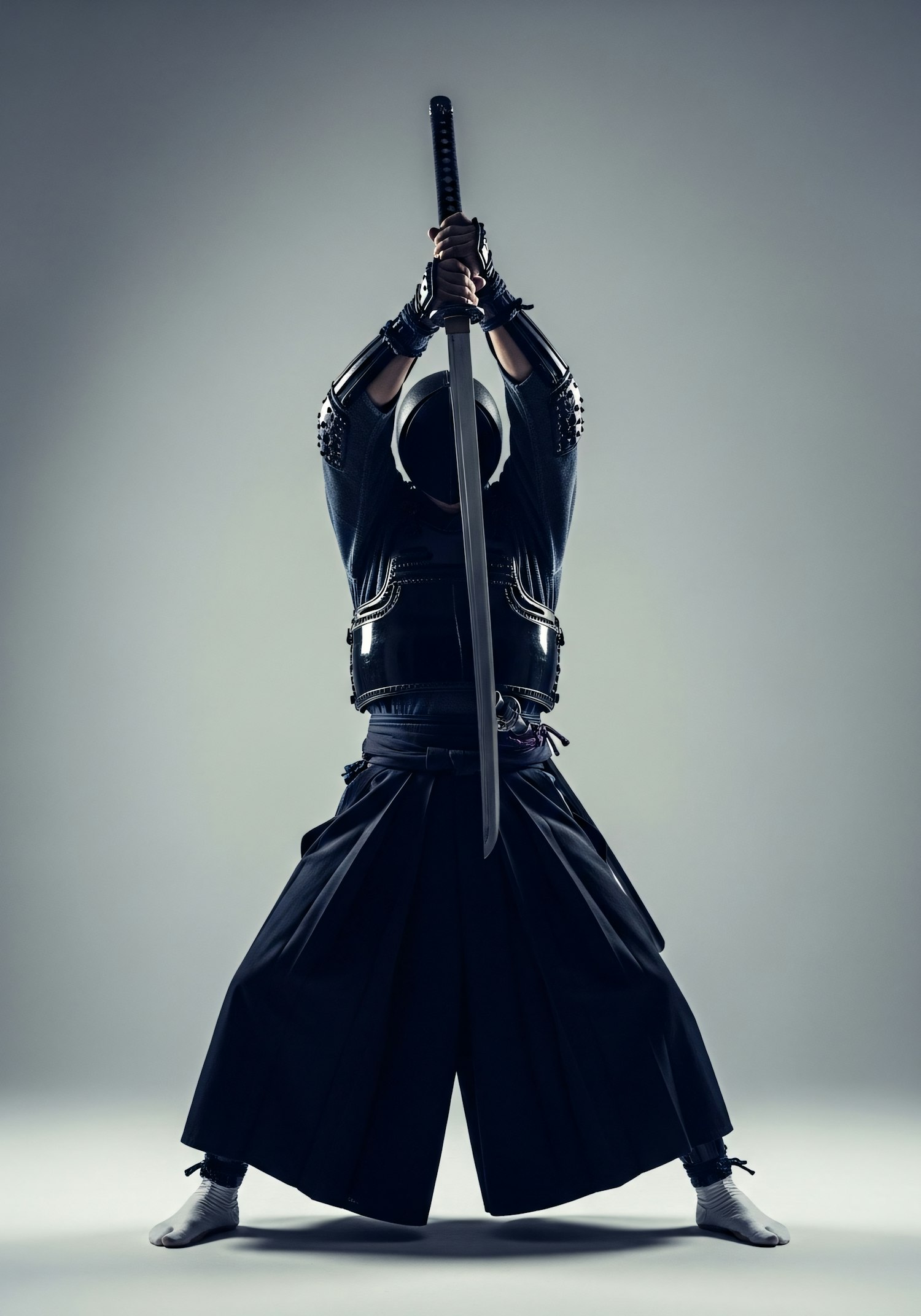 A kendo practitioner in full armor holds a katana overhead, showcasing traditional martial arts attire and a poised stance.