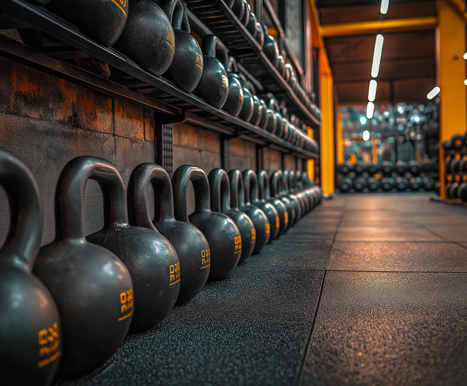 Neatly arranged black kettlebells on a gym floor with warm lighting and mirrored walls, creating a focused workout atmosphere.
