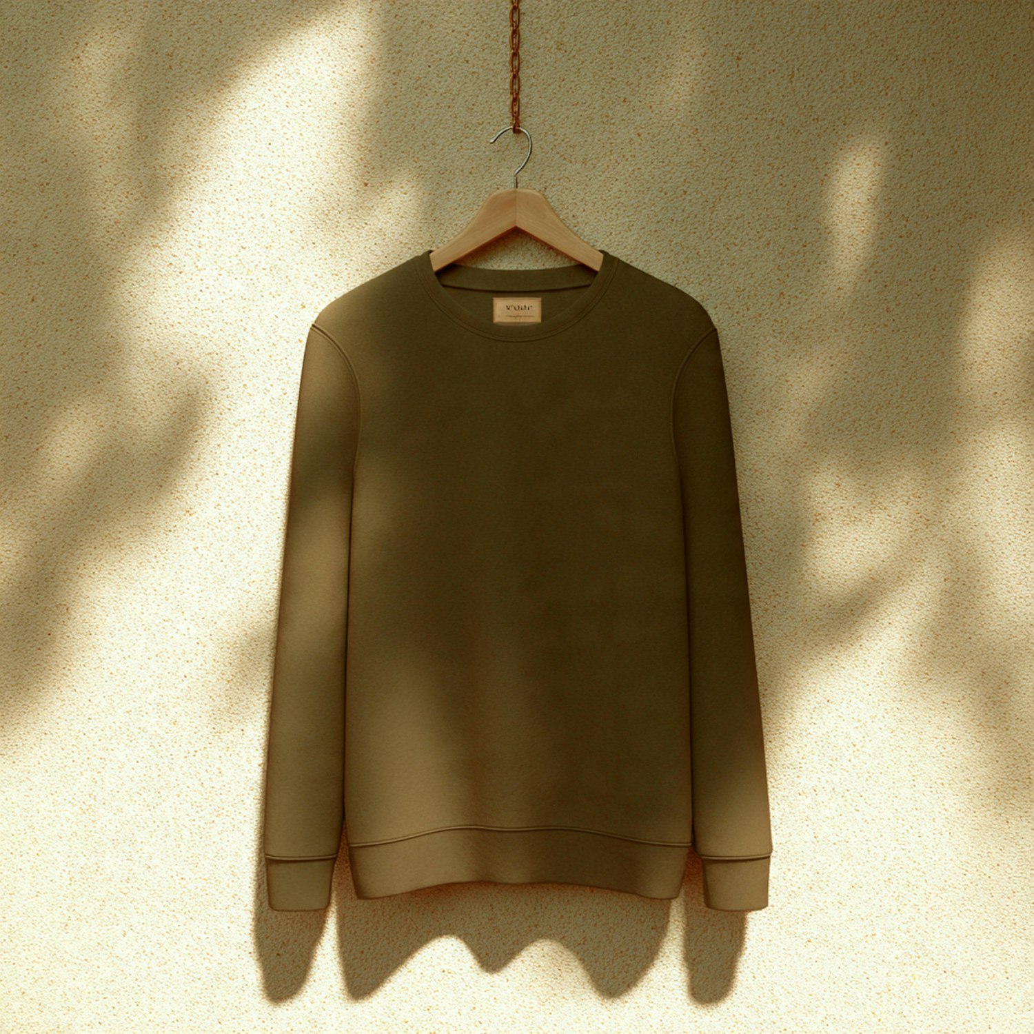 Khaki sweatshirt on a wooden hanger against a beige wall with soft shadows, showcasing minimalist design and natural ambiance.