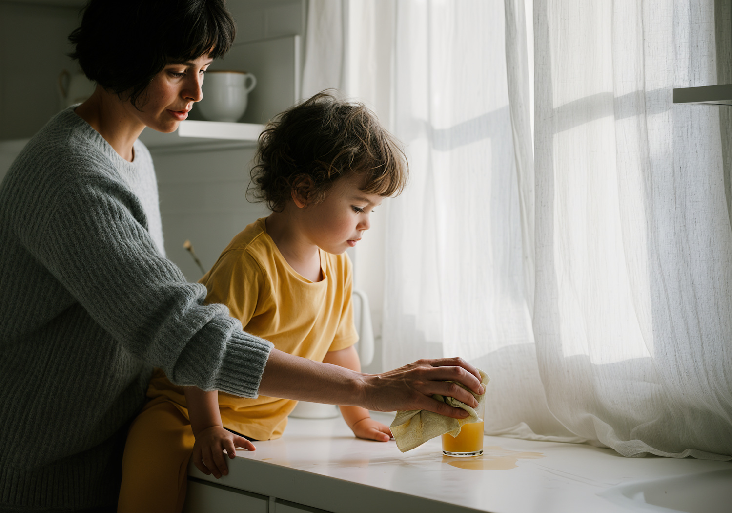 A woman and child clean up a juice spill on a white counter, bathed in soft natural light from nearby curtains.