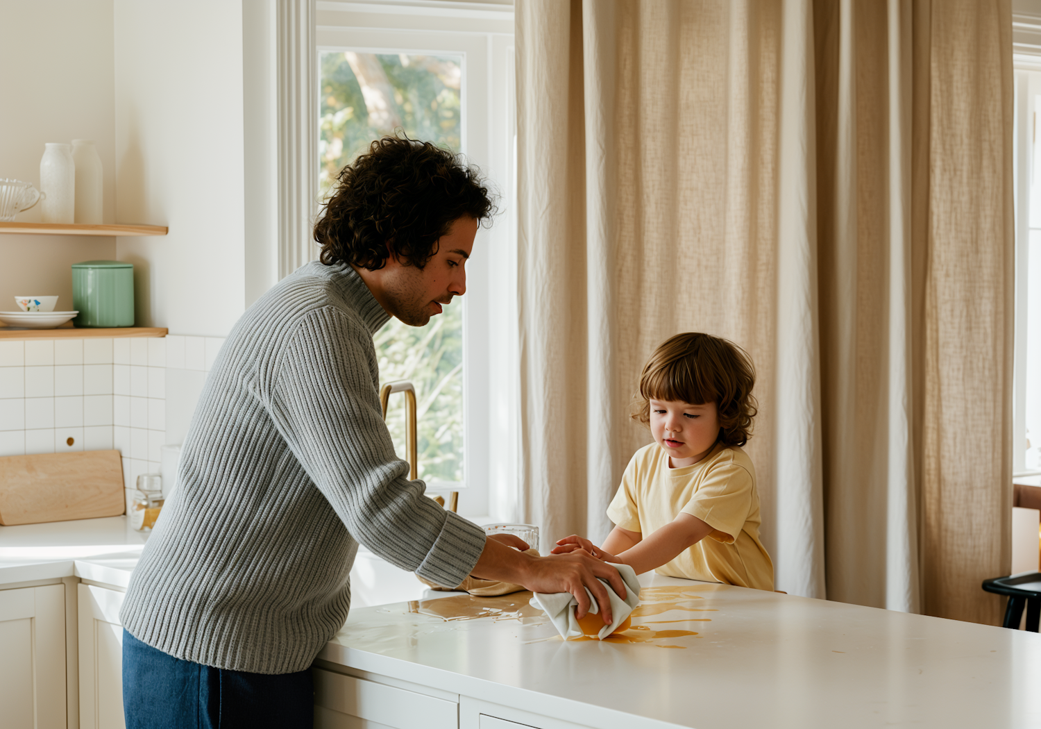 A man and child clean a spill on a white kitchen counter in a bright, modern kitchen, showcasing teamwork and care.