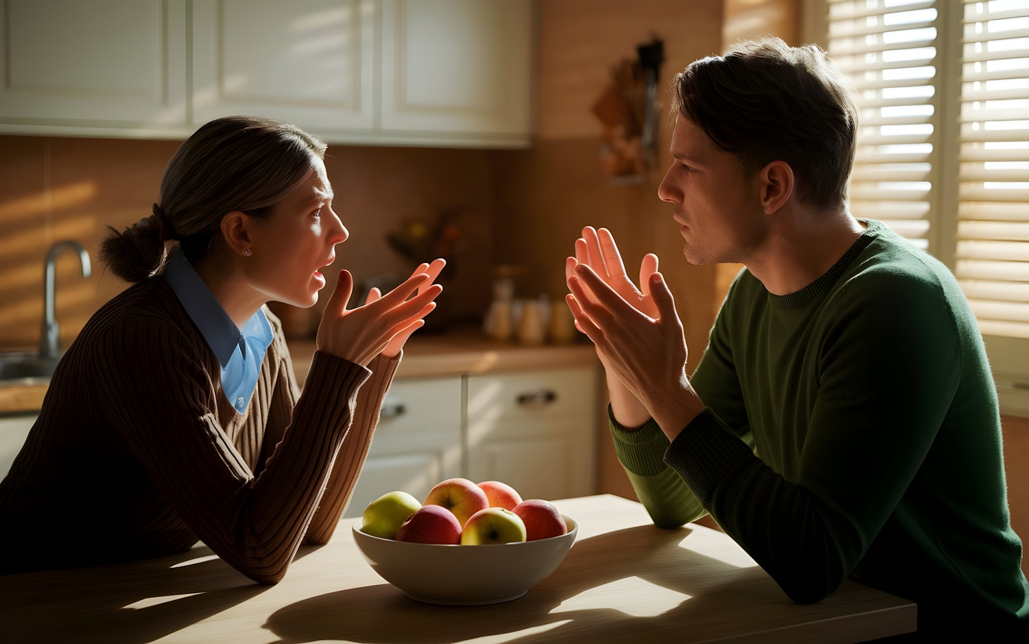 A couple having an intense discussion in a sunlit kitchen, with a bowl of apples on the table between them.