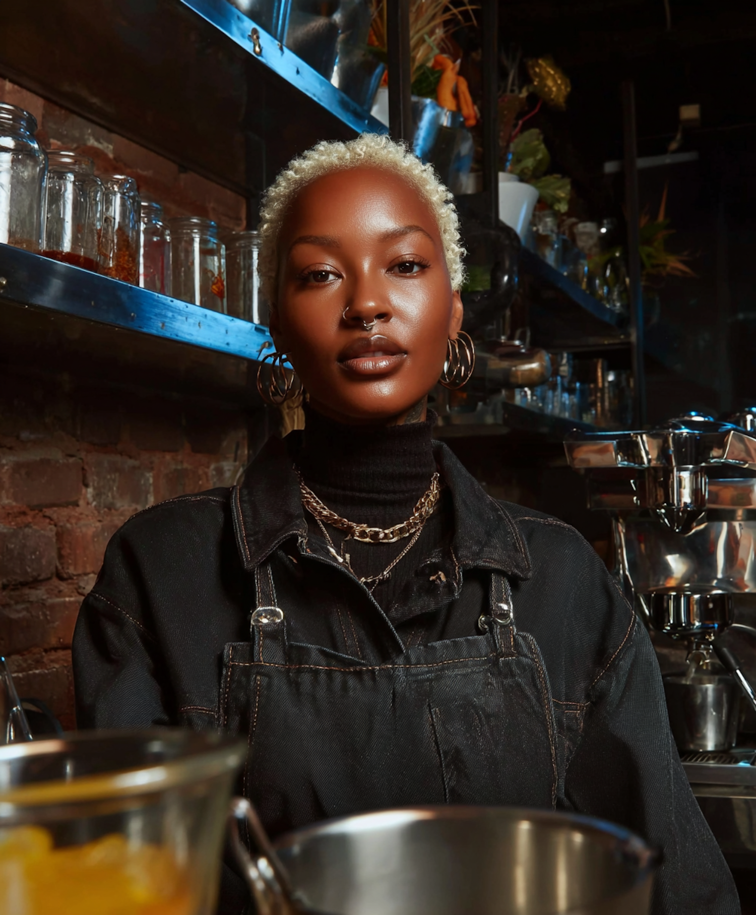 Close-up of a stylish person with blonde hair in a modern kitchen setting, surrounded by culinary tools and pantry jars.