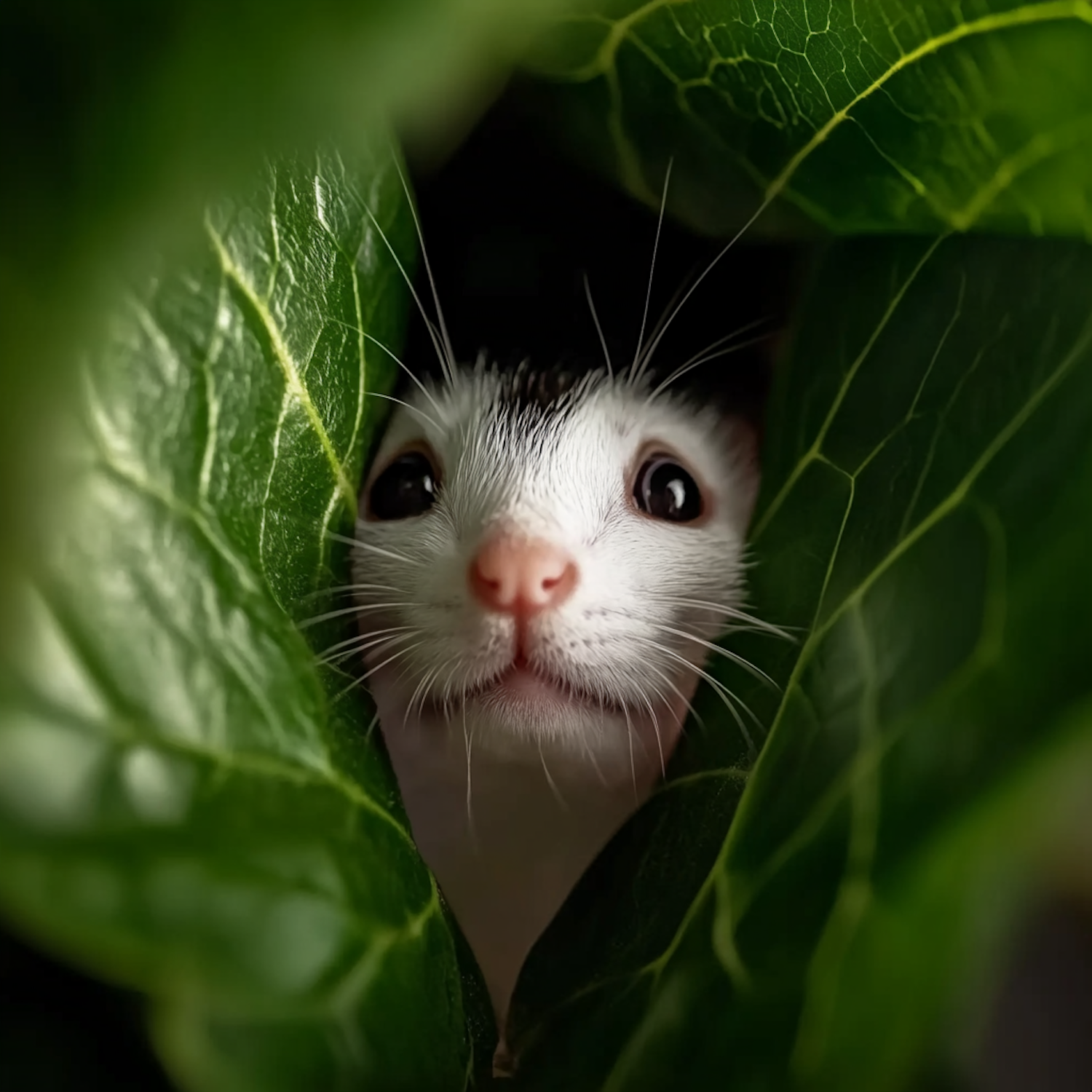 Adorable kitten peeking through lush green leaves, showcasing its curious eyes and pink nose in a serene, intimate setting.