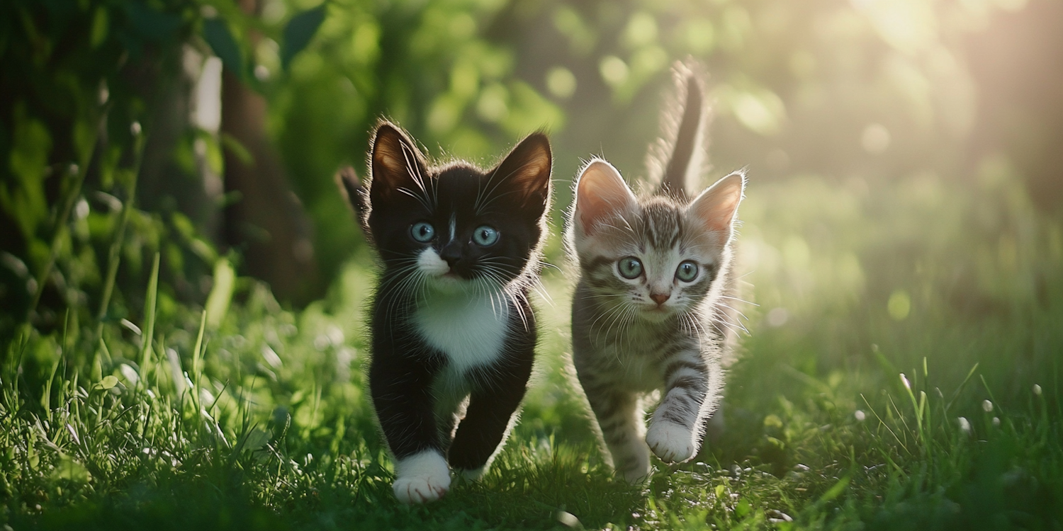 Two playful kittens, one black and white, the other tabby, exploring a sunlit grassy field with a serene natural backdrop.