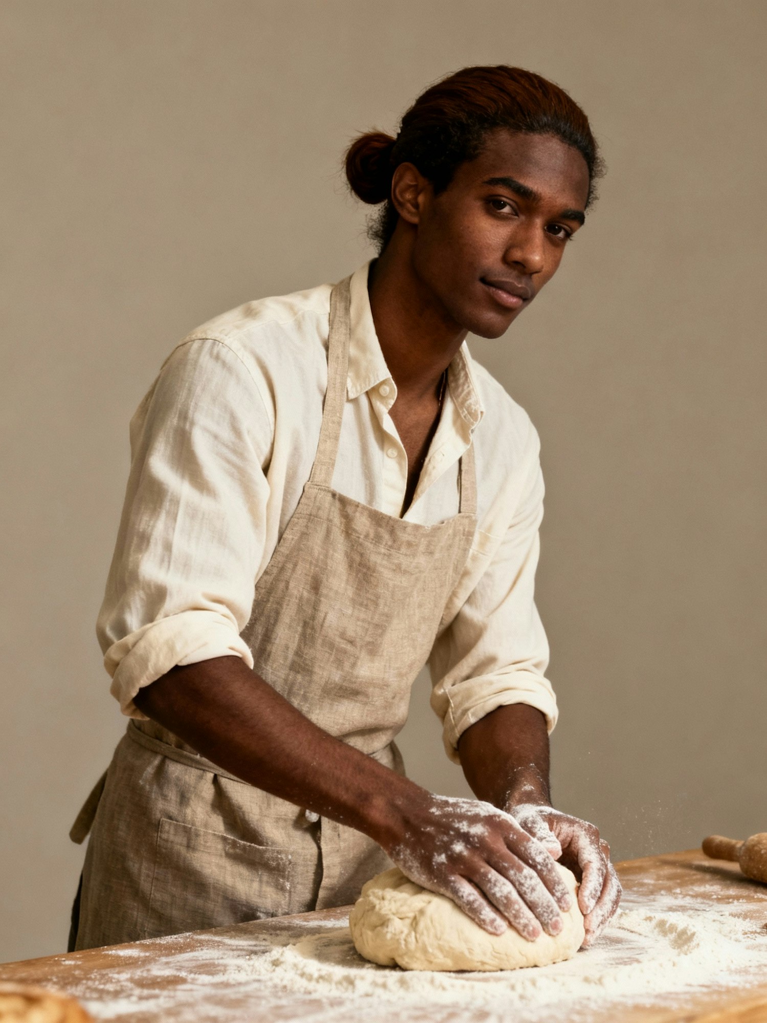 Studio portrait of a young male bakery owner in his mid-twenties with deep cool skin; chestnut hair in a low bun, linen apron over a cream shirt, light flour dust on hands, kneading dough on a floured bench; neutral seamless backdrop; Rembrandt lighting; 105mm macro-sharp detail; photorealistic, editorial. Expression: warm, entrepreneurial confidence. Negative: “youthifying” skin blur, exaggerated smoothing, brand logos, watermark.
