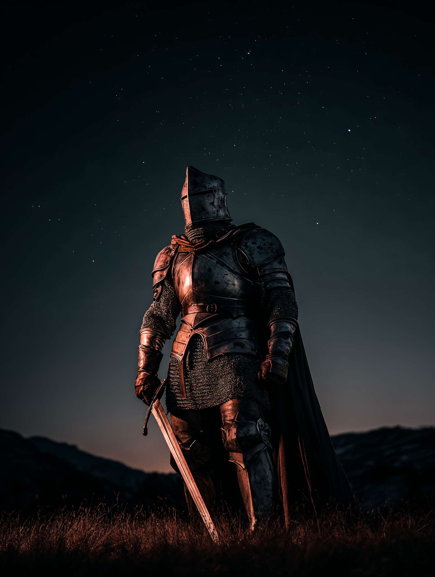 A knight in full armor stands under a starry sky, holding a sword, with a dramatic glow highlighting their silhouette.