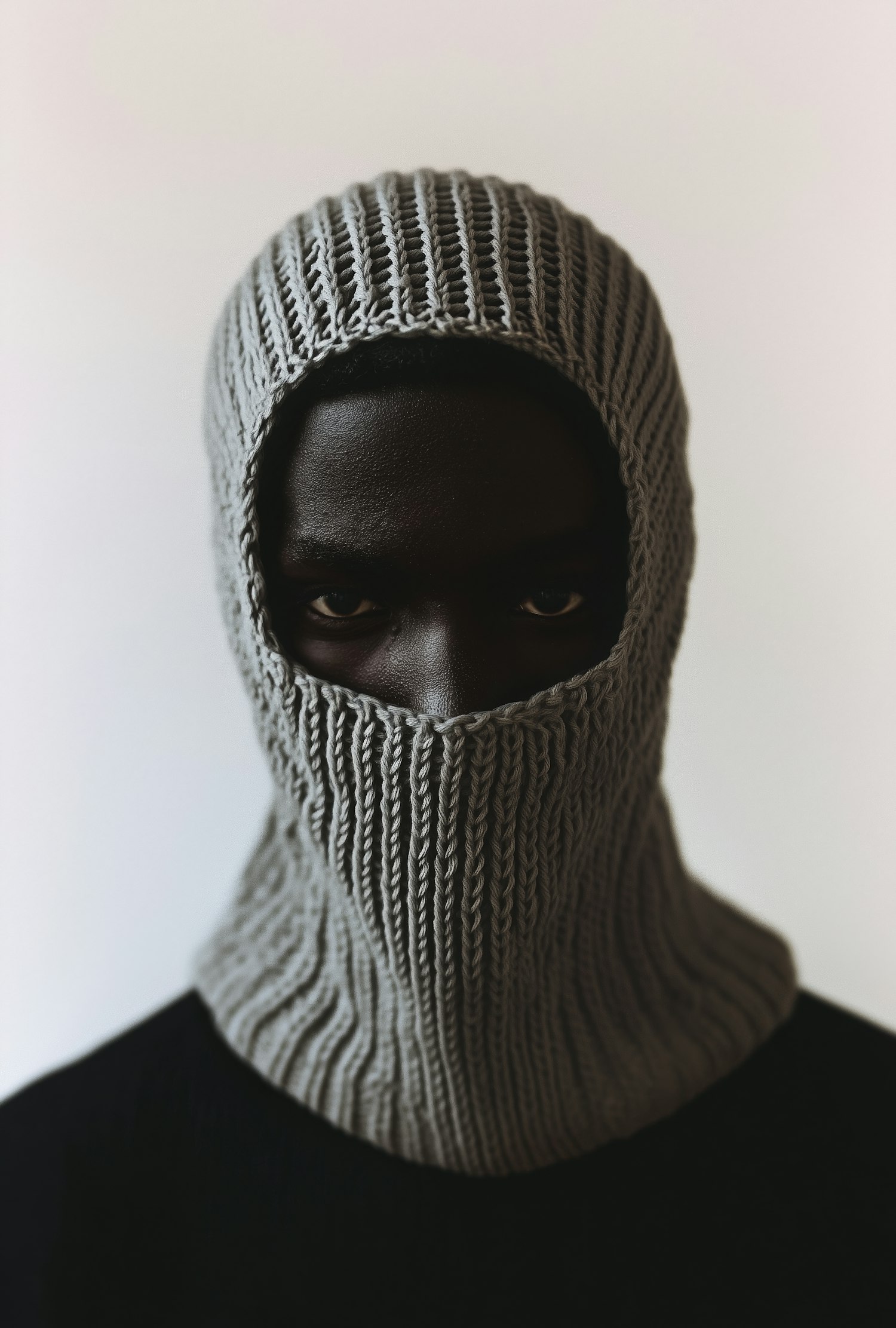 A close-up of a person wearing a gray knitted balaclava, with a soft gradient background and an intense, focused gaze.