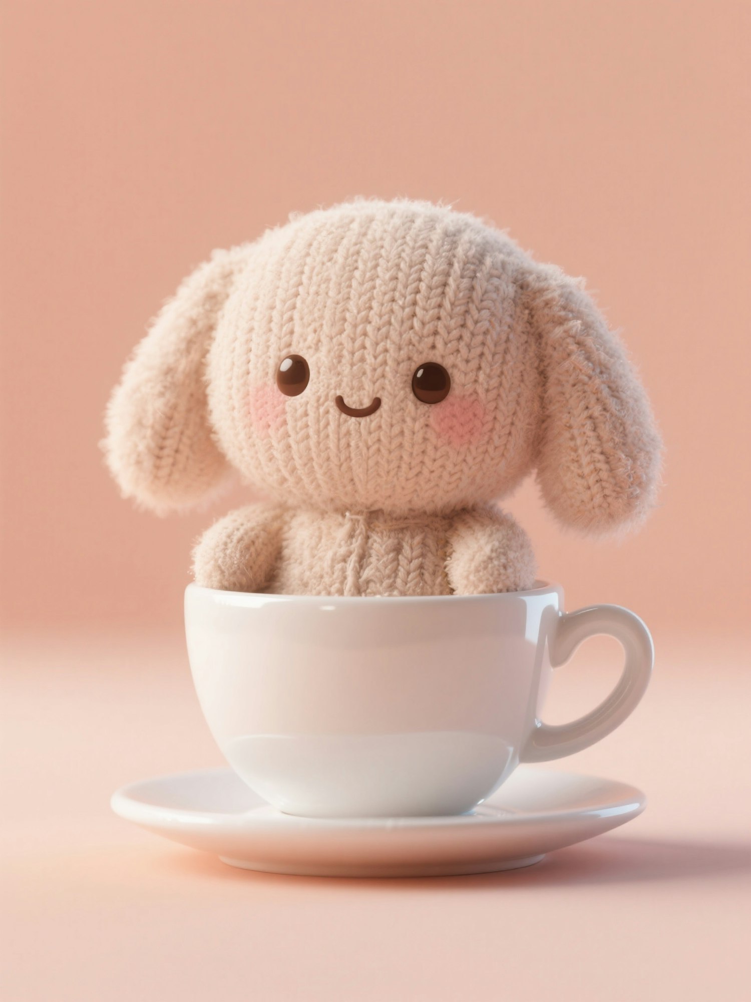 A soft 3D character made of plush or knitted fabric, with a cute cartoon face, sitting in a teacup, pastel peach background, hyper-realistic texture, Pixar style lighting, highly detailed and soft-focused render