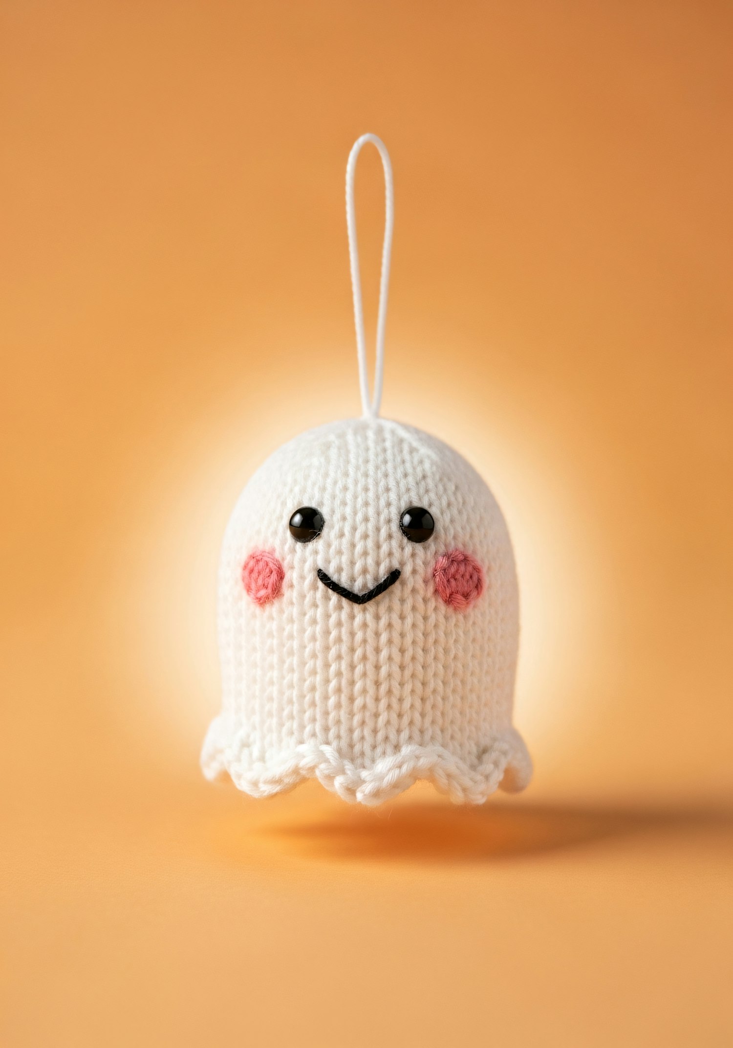 A cute knitted ghost ornament with a smiling face and pink cheeks, hanging on an orange background.