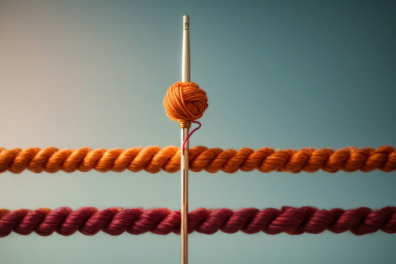 Vertical knitting needle with orange yarn ball, set against a gradient background with orange and burgundy yarn ropes.