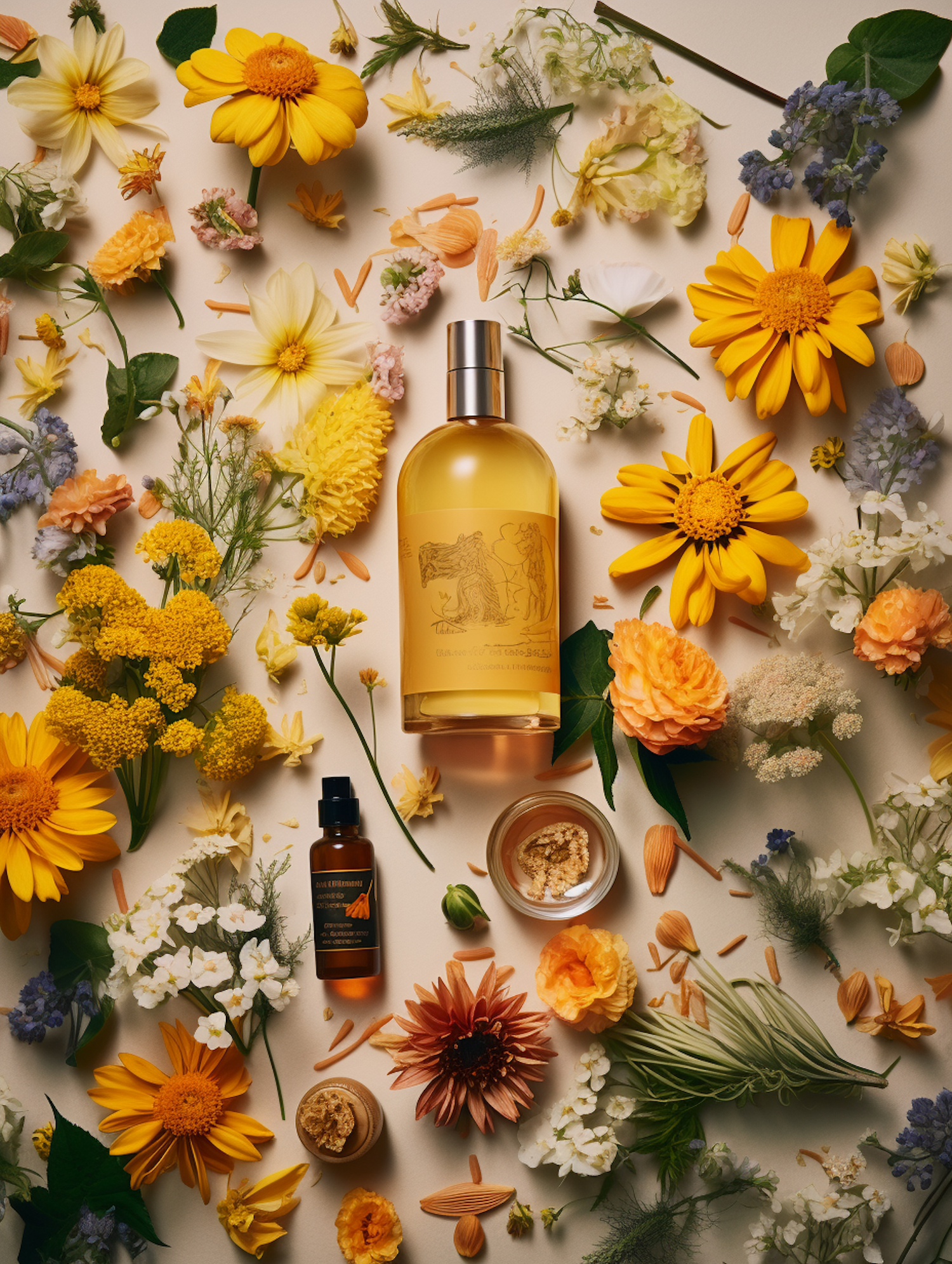 Vibrant floral arrangement with beauty products, featuring yellow daisies and marigolds on a light background.