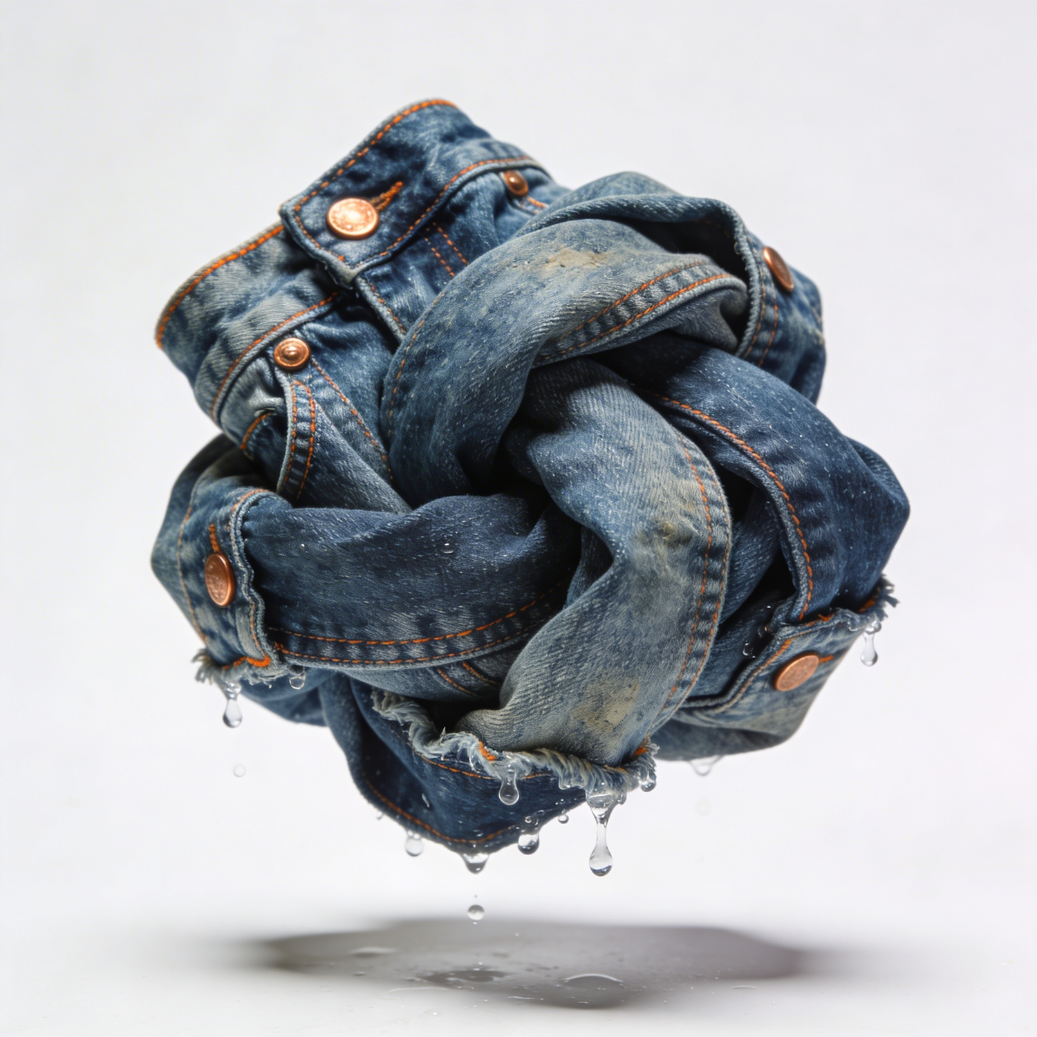 A hyper-realistic studio photograph of twisted denim jeans sculpted into an abstract organic form, floating against a pure white background. The vintage blue jeans are artfully knotted and folded, showcasing authentic denim texture with visible orange stitching, copper rivets, faded wear patterns, and classic five-pocket detailing. Crystalline water droplets cling to and drip naturally from the lower edges of the fabric, catching the light as they fall. Soft, diffused studio lighting creates subtle shadows beneath the floating sculpture while maintaining sharp focus on every thread and fiber detail of the weathered denim material.