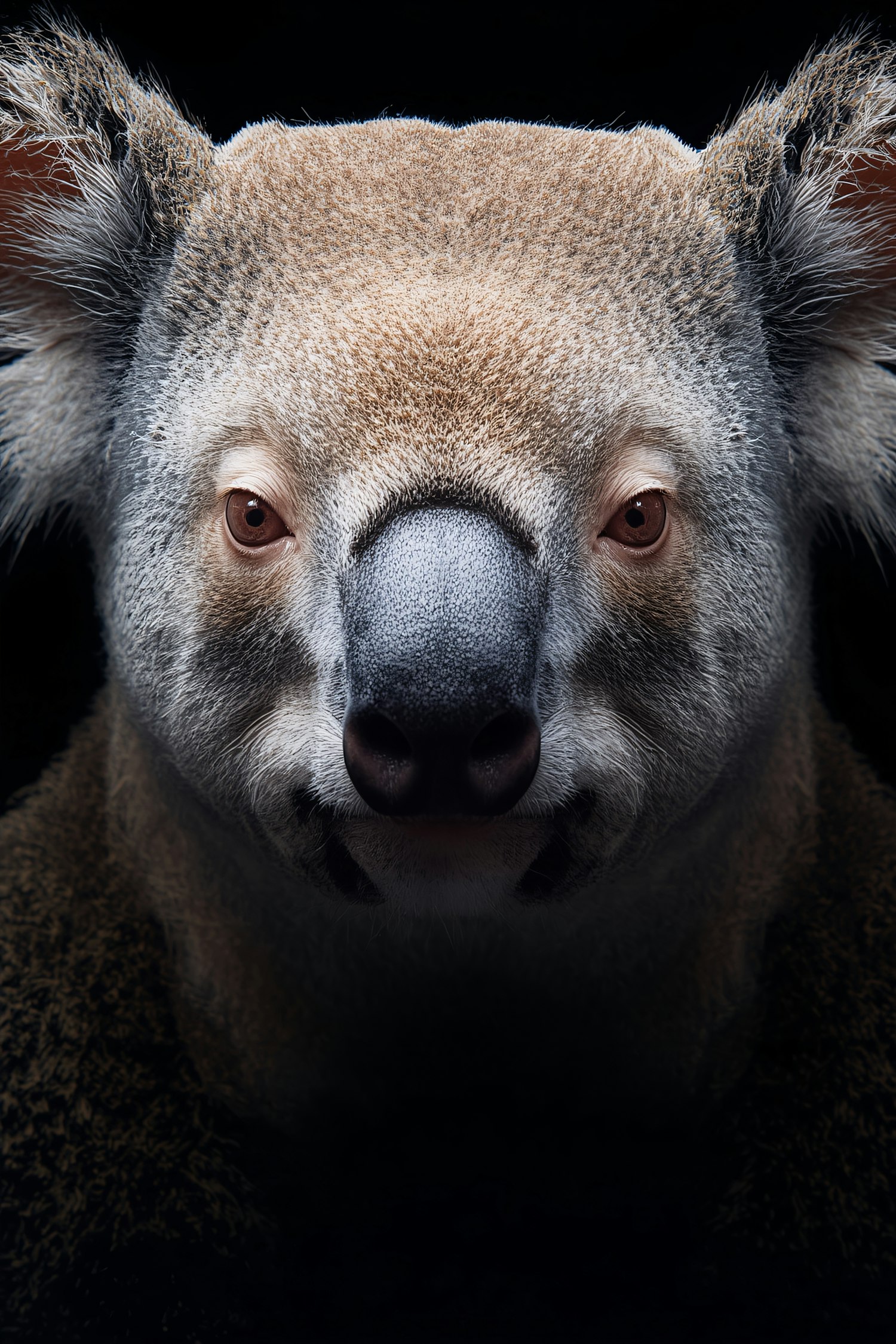 Close-up of a koala with detailed fur texture and expressive eyes, set against a dark background for a dramatic effect.