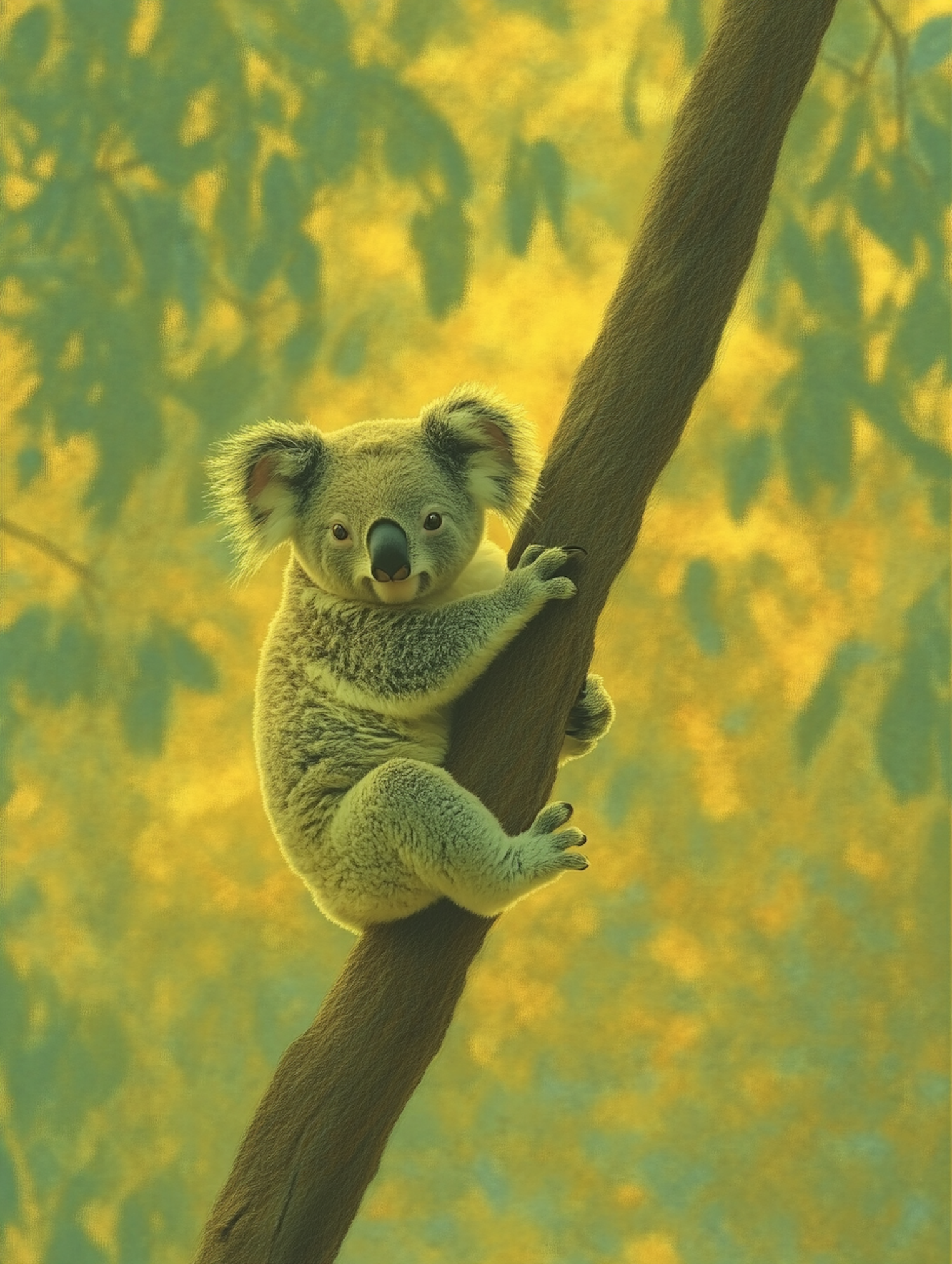 Adorable koala clinging to a tree in a sunlit forest, showcasing its fluffy ears and expressive eyes.