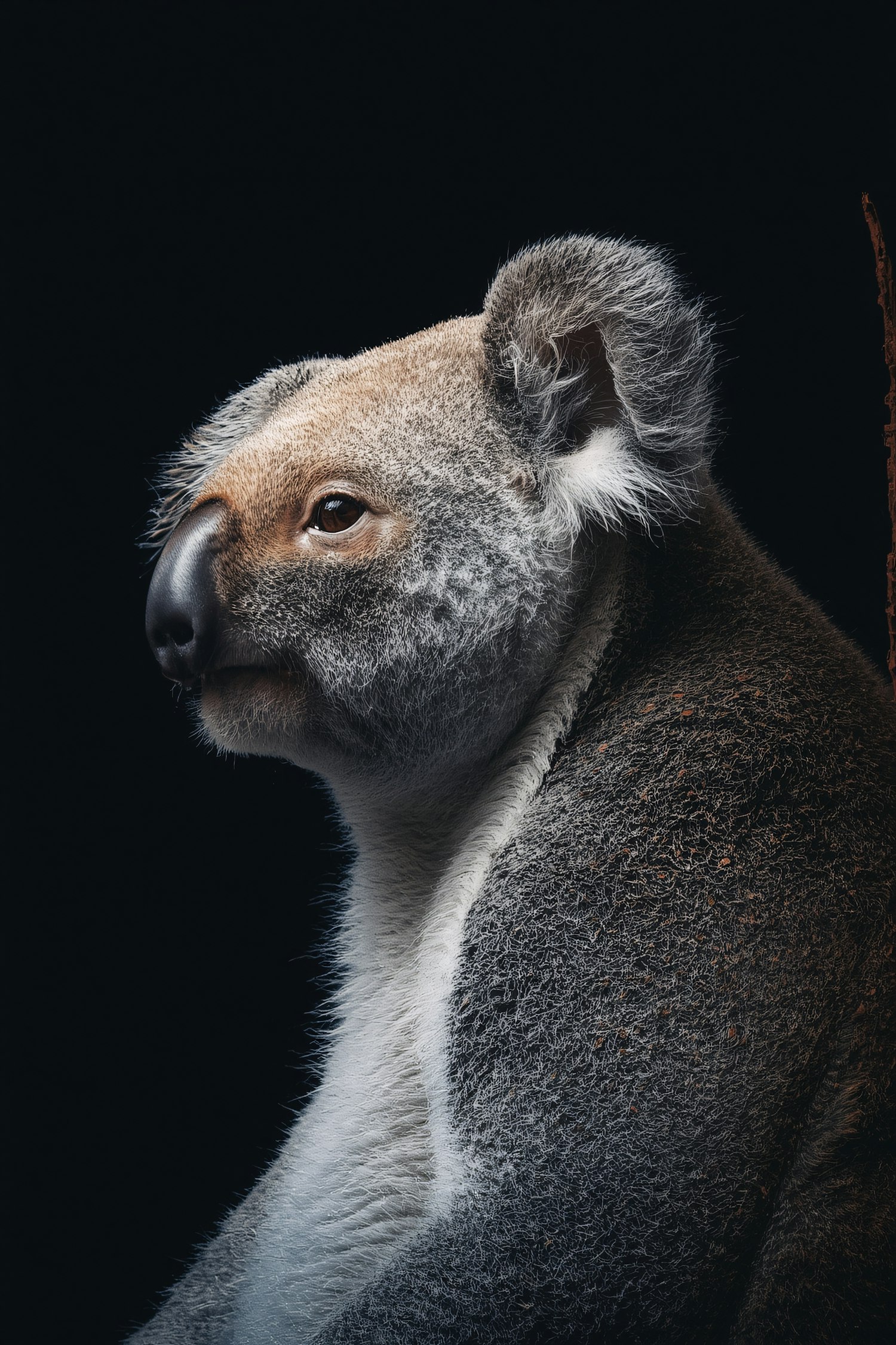 A close-up of a koala with detailed fur texture and a dark background, highlighting its expressive features and natural beauty.