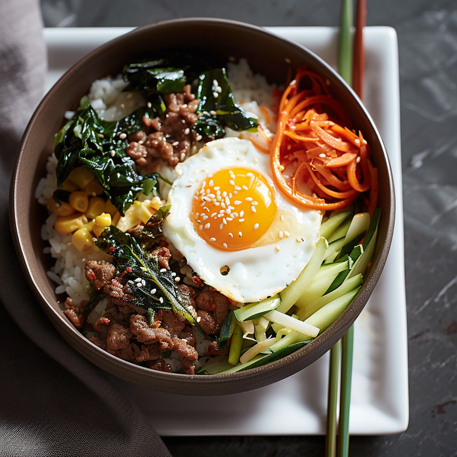 Colorful bibimbap bowl with egg, beef, spinach, corn, cucumber, and carrots, beautifully arranged on rice.