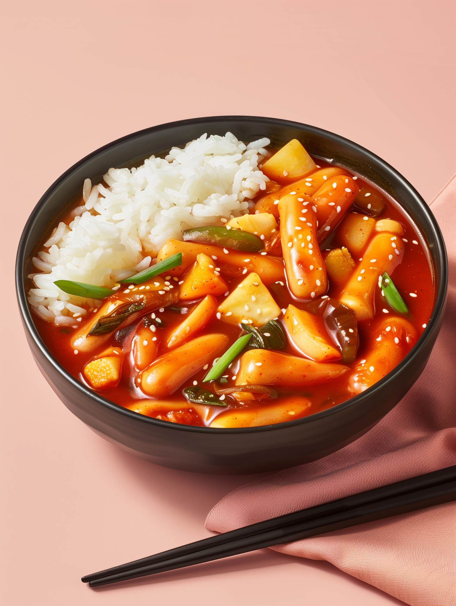 Delicious tteokbokki with rice in a black bowl, garnished with sesame seeds and green onions, on a pink surface with chopsticks.