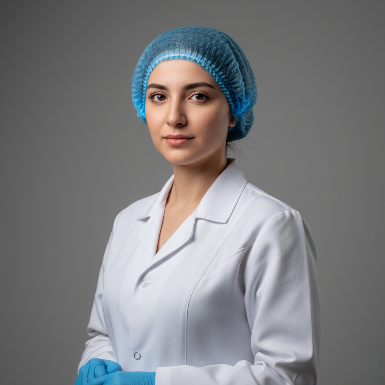 A professional in a white lab coat and blue hair cover, exuding focus and readiness in a clinical or laboratory setting.