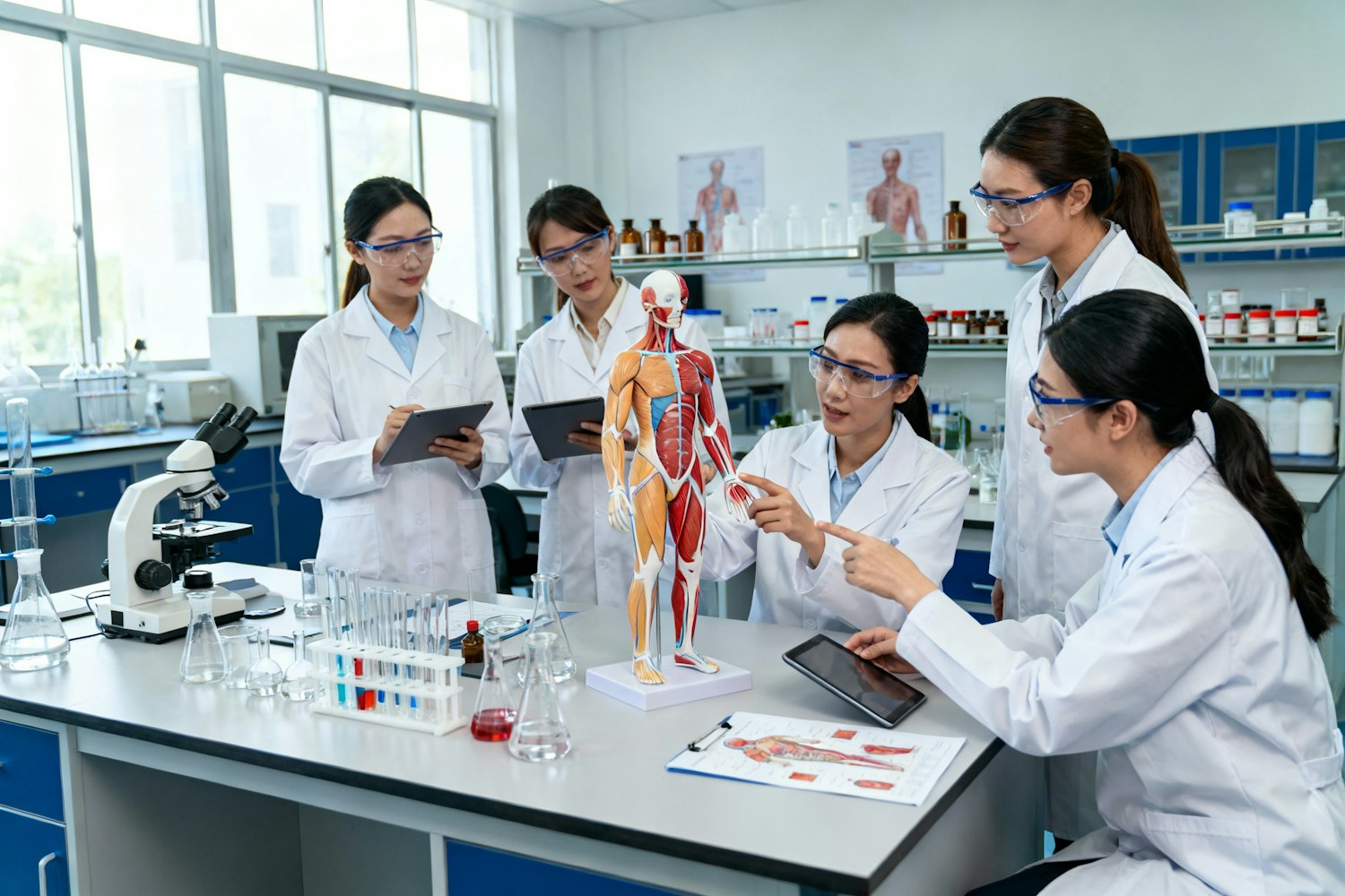A group of scientists in a lab discussing a human anatomy model, surrounded by lab equipment and tools, fostering a collaborative environment.