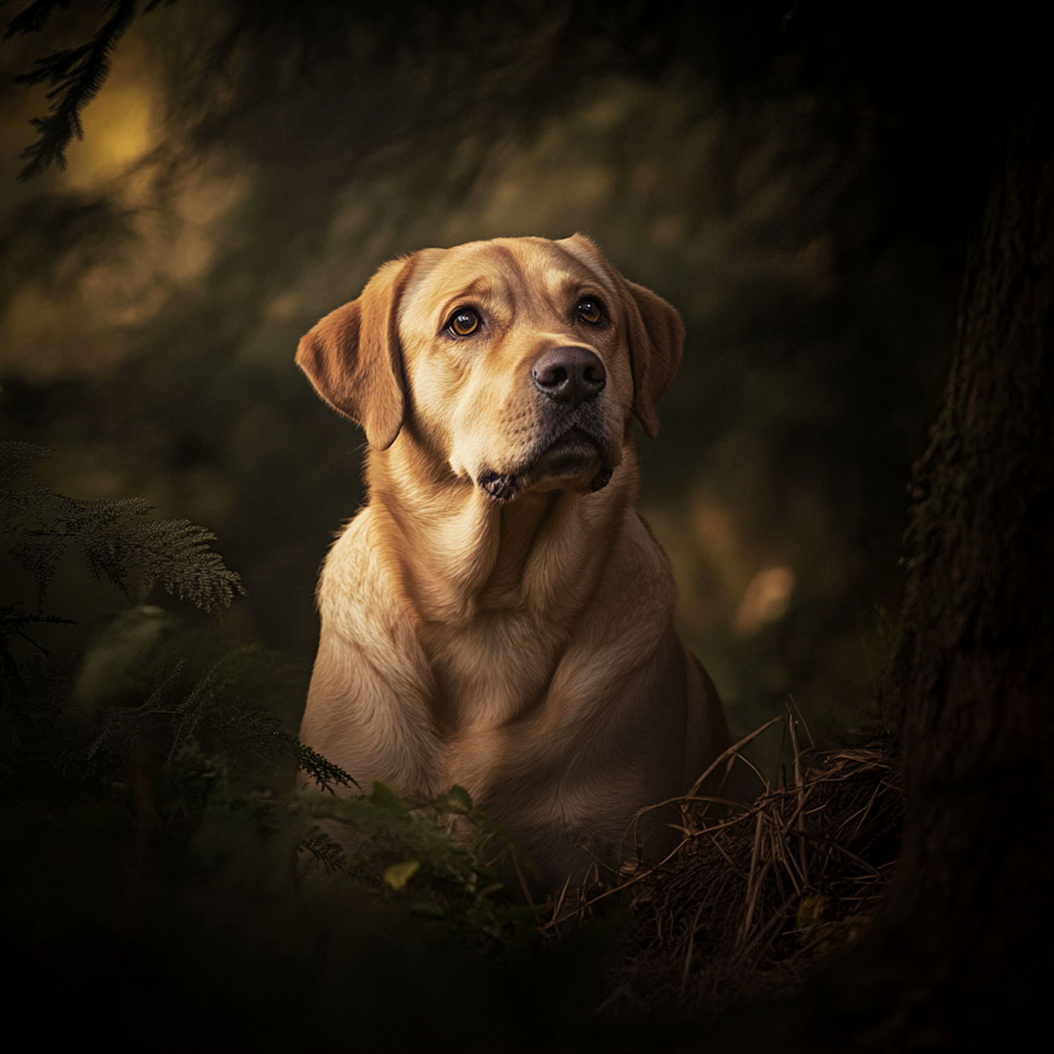 Golden Labrador Retriever in a serene forest setting, surrounded by lush greenery and soft, warm lighting.