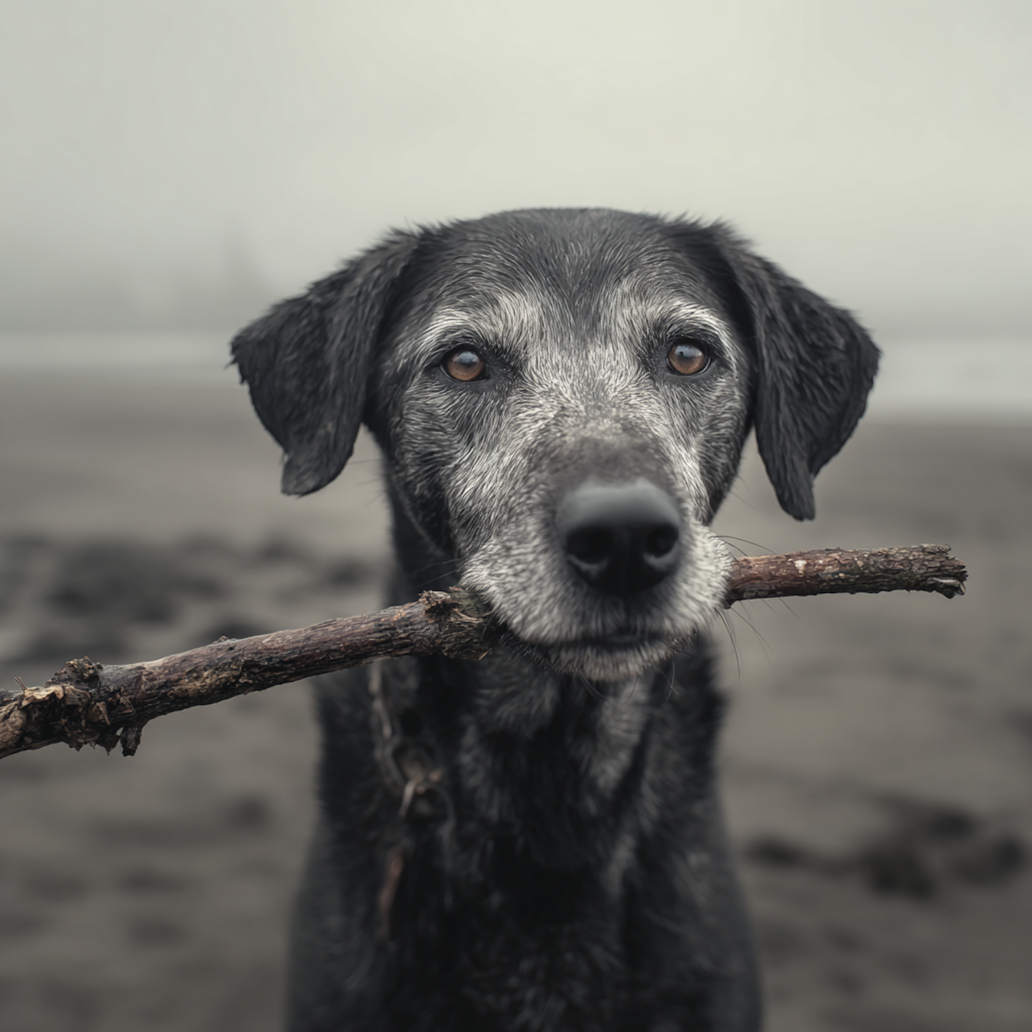 A black Labrador Retriever with a graying muzzle holds a stick on a foggy beach, its brown eyes focused on the camera.