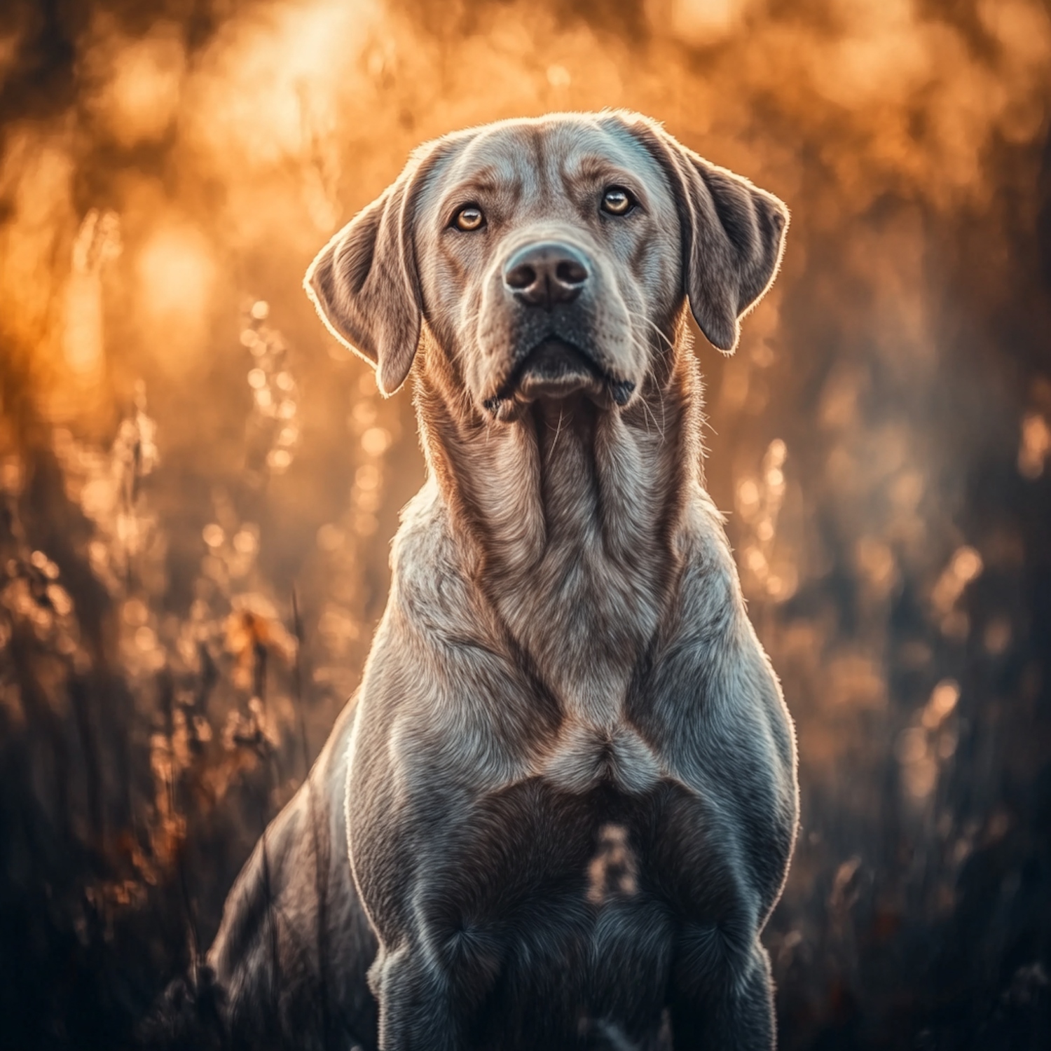 Majestic Labrador Retriever in a golden sunset field, showcasing its glossy coat and striking amber eyes in a serene natural setting.