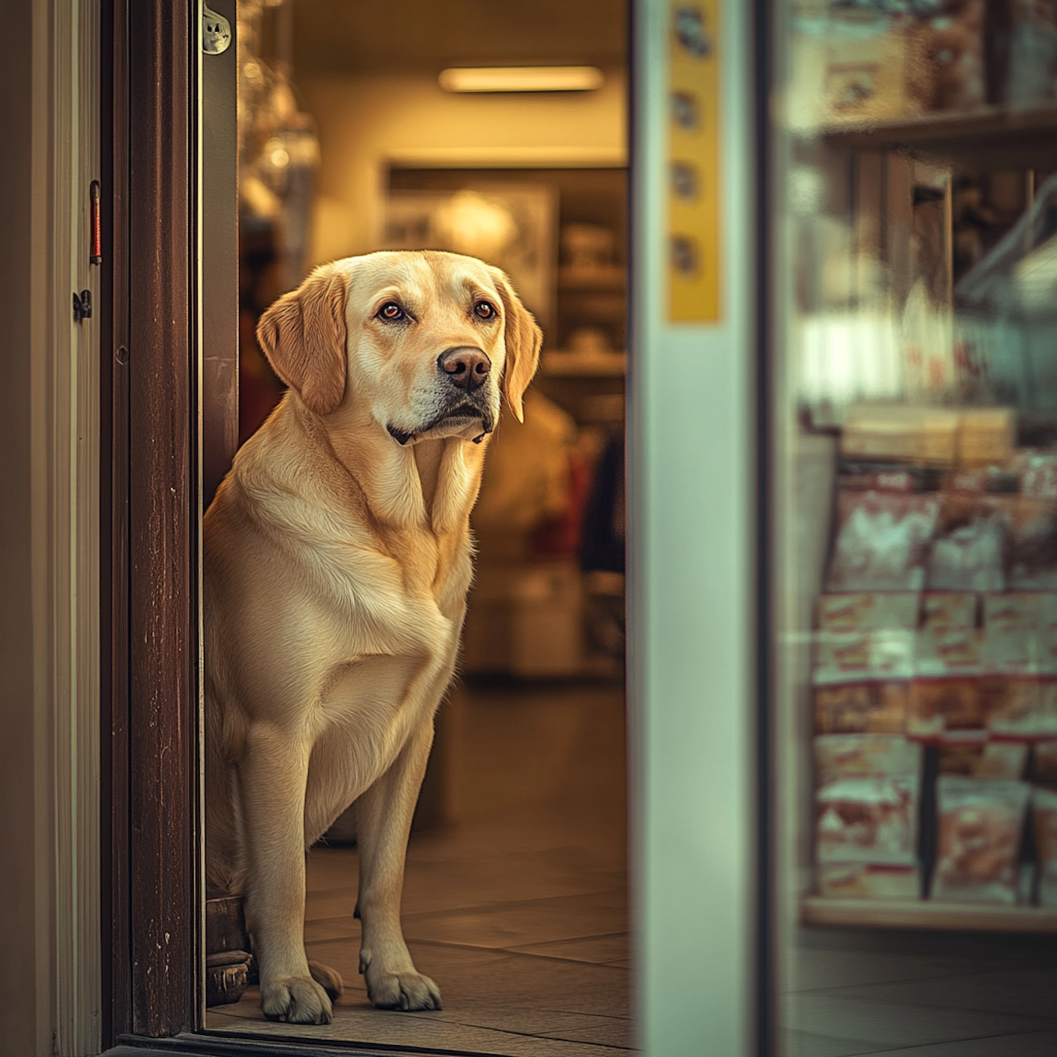 Golden Labrador stands in shop doorway, gazing outside with calm expression. Warm lighting and cozy atmosphere inside.