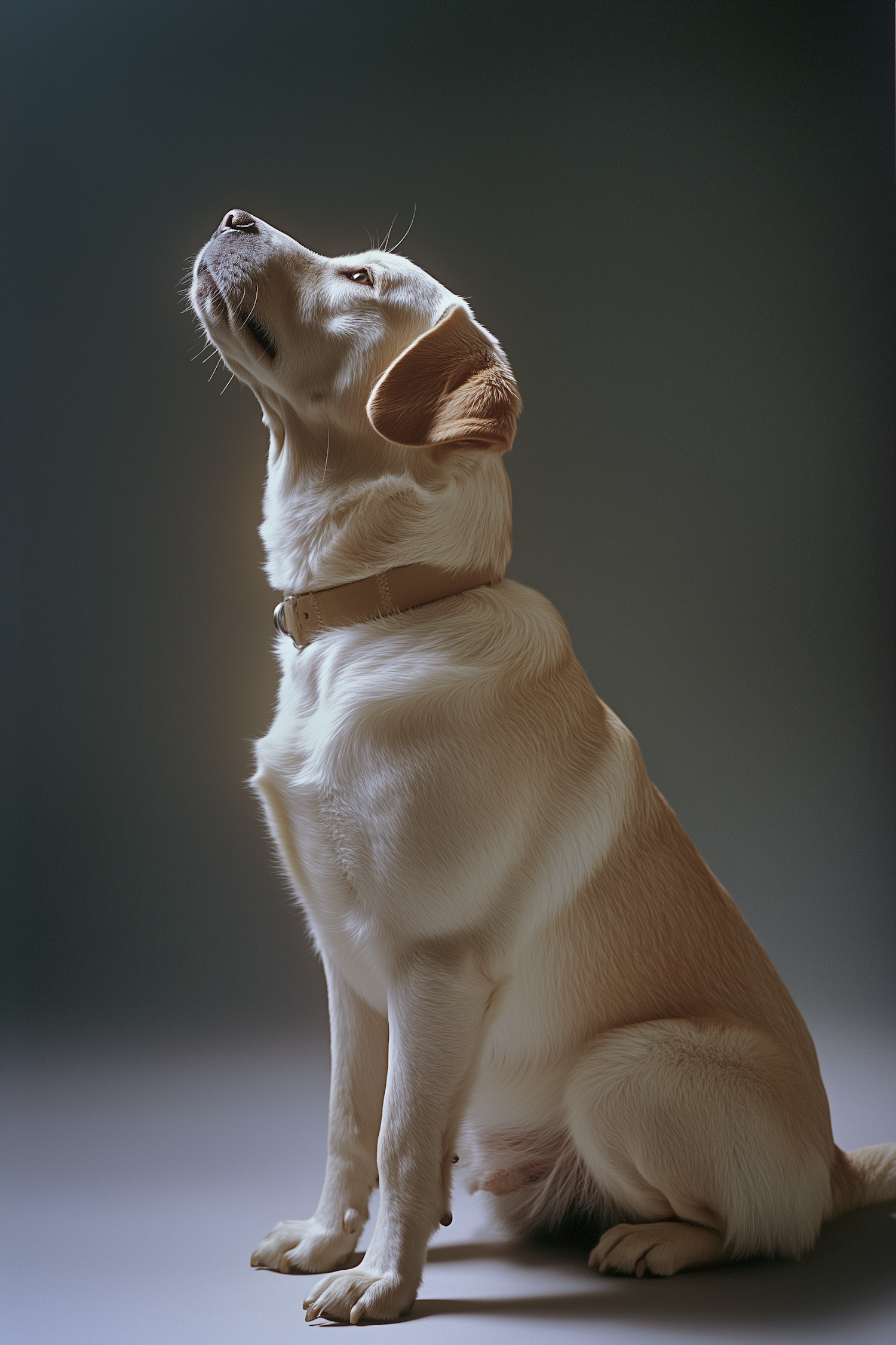 A Labrador Retriever with a creamy coat sits gracefully, looking upwards. Soft lighting highlights its gentle features.