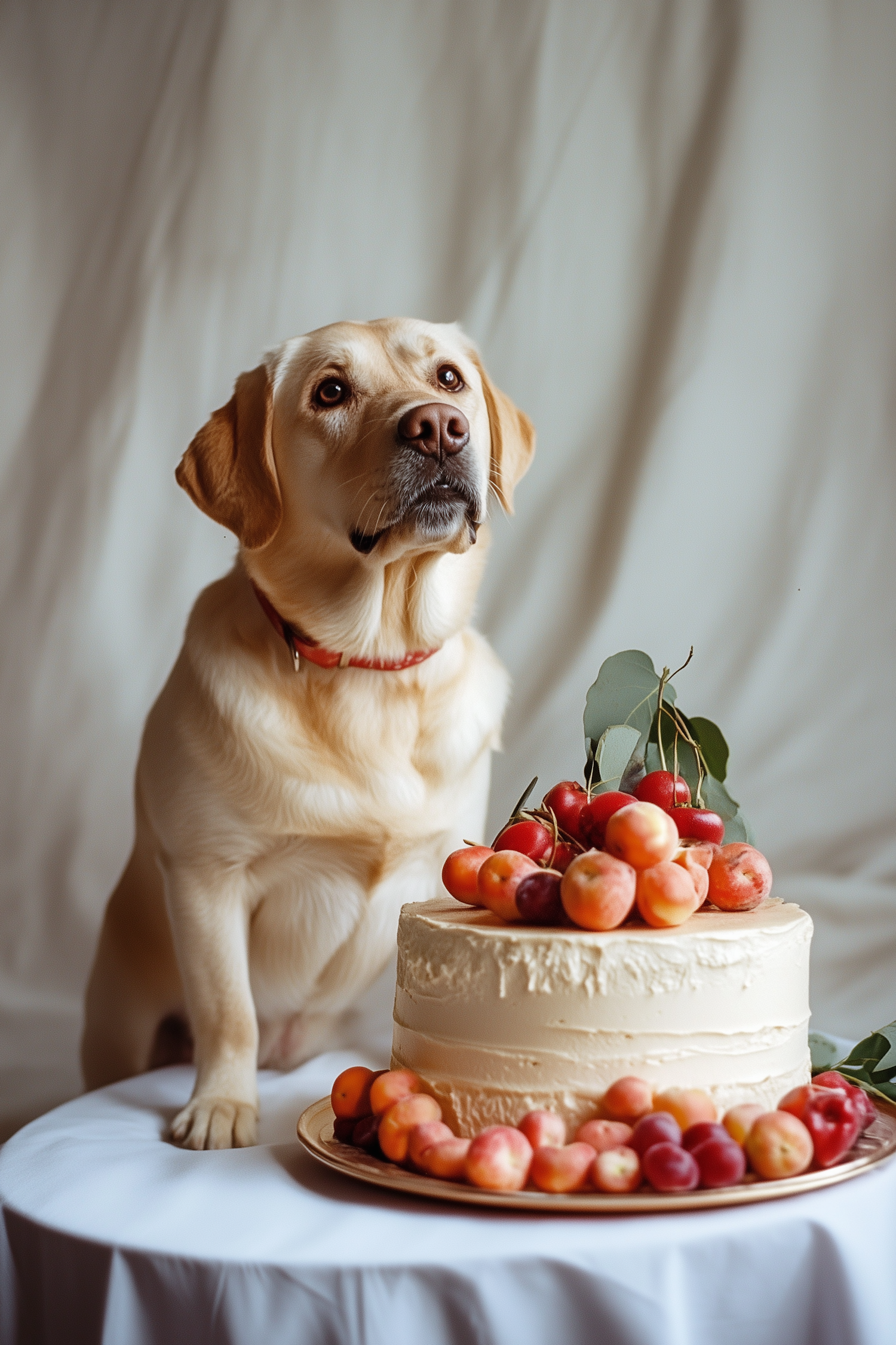 Golden Labrador with a red collar sits beside a fruit-adorned cake on a white tablecloth, creating a charming and serene scene.
