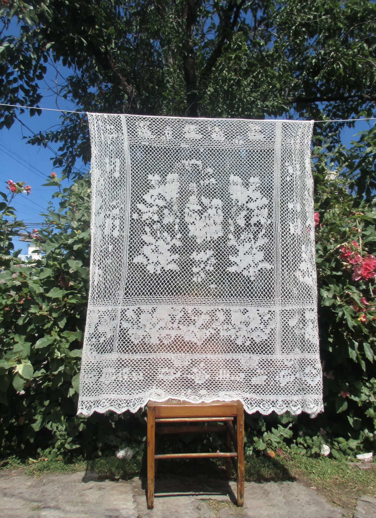 A white lace cloth with floral patterns hangs outdoors on a line, with a wooden stool beneath, surrounded by greenery and flowers.