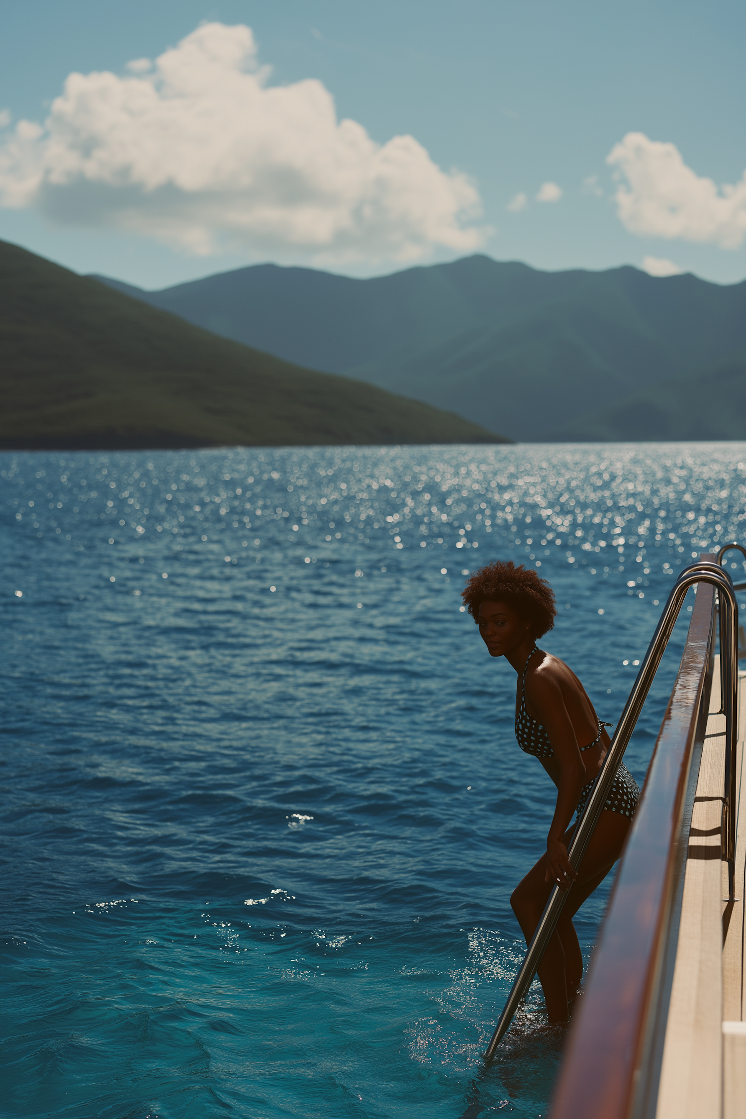 A person in a polka-dot swimsuit descends a boat ladder into sparkling blue water, with scenic hills and a bright sky in the background.