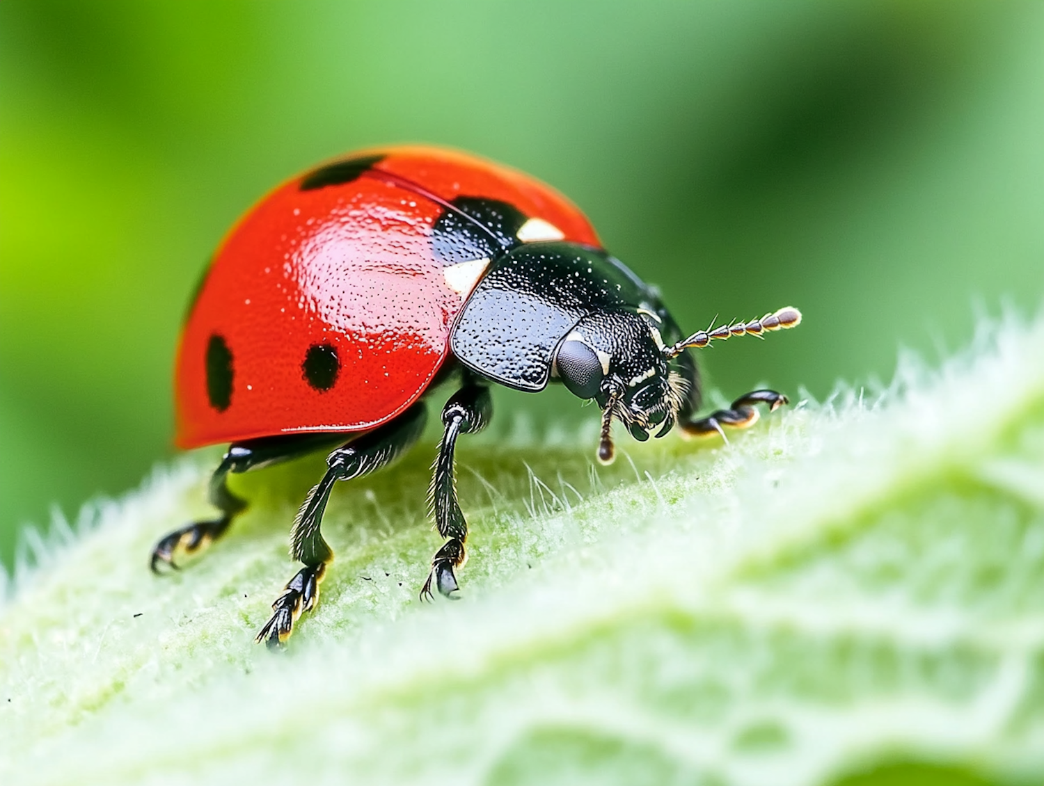 Close-up of a vibrant ladybug on a green leaf, showcasing its glossy red shell with black spots and detailed legs.