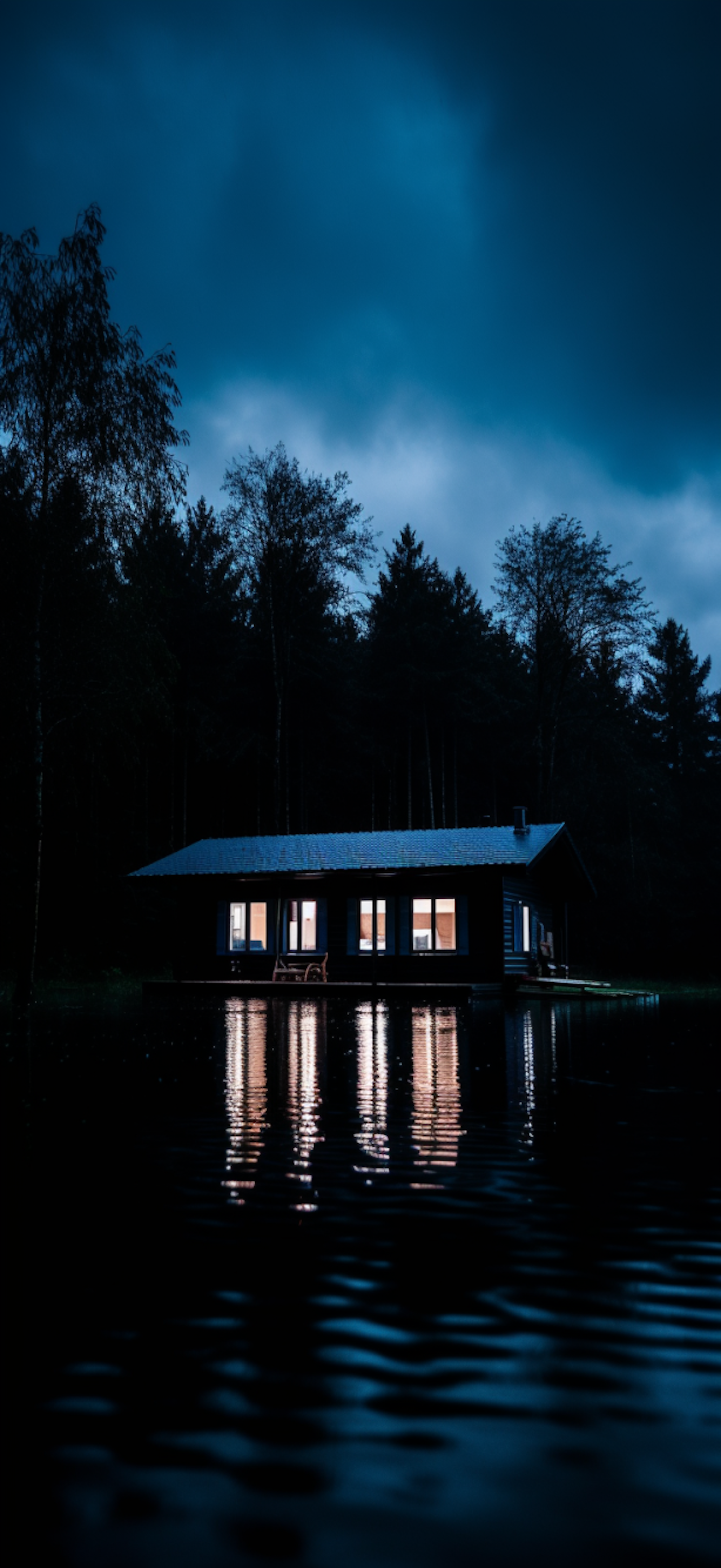 Tranquil cabin by a lake at twilight, with warm lights reflecting on calm water and surrounded by tall trees under a moody sky.
