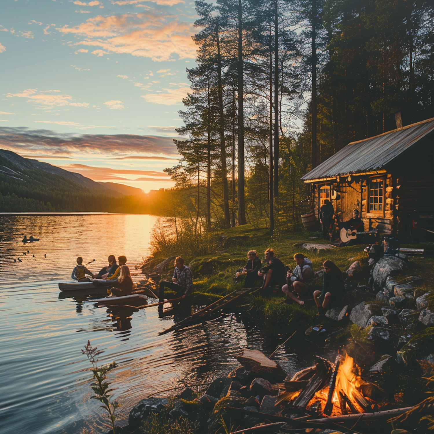 Lakeside sunset gathering with friends by a campfire, rustic cabin, and canoes. Warm, serene atmosphere with music and nature.