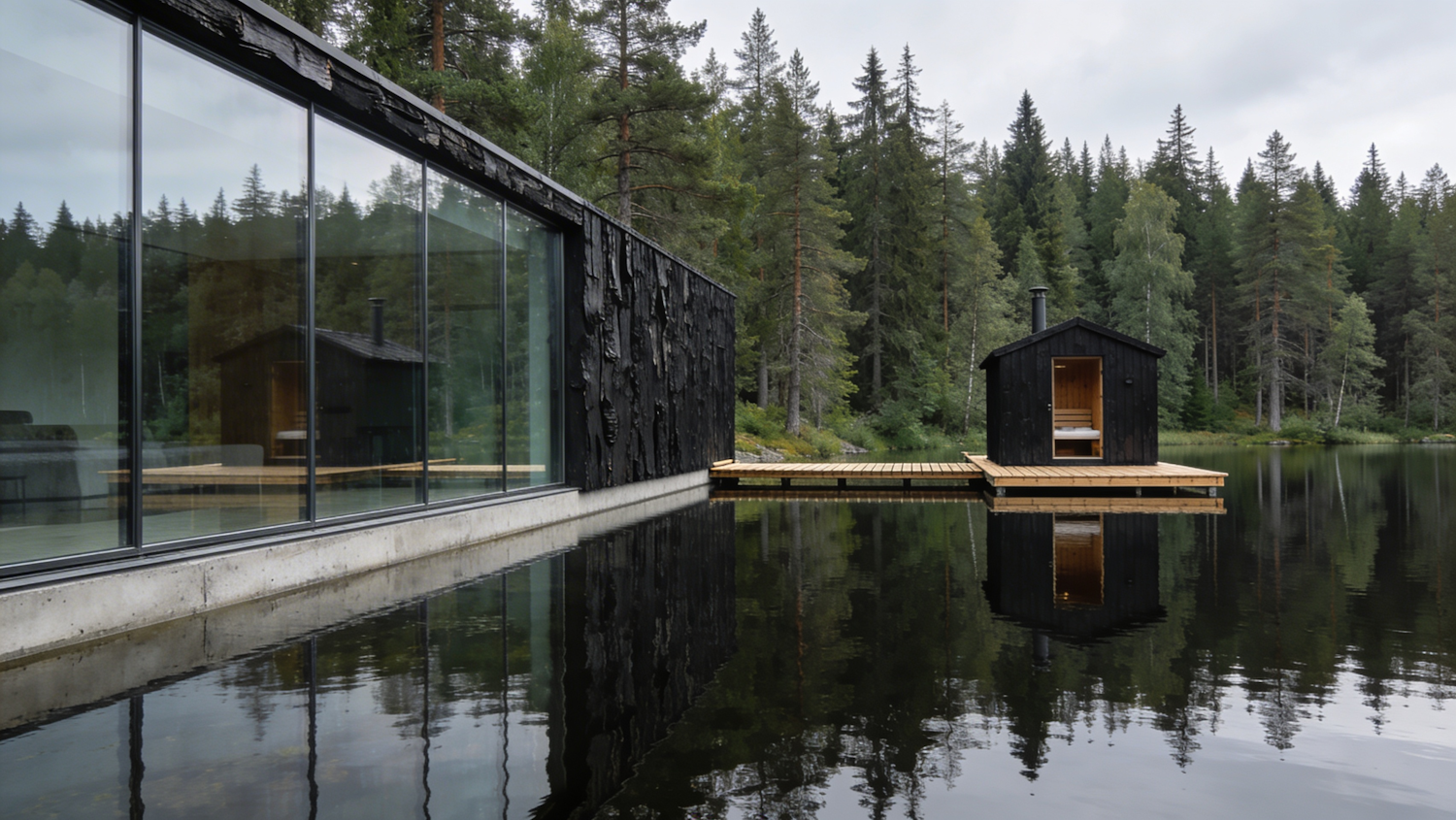 A minimal glass and timber volume sitting at the edge of a still lake in Finnish Lapland. Almost entirely transparent on the lake side, almost entirely closed on the forest side. The house acts as a threshold between dense pine forest and open water. A private sauna volume sits detached at the water's edge connected by a timber boardwalk. Materials: charred timber, glass, concrete.