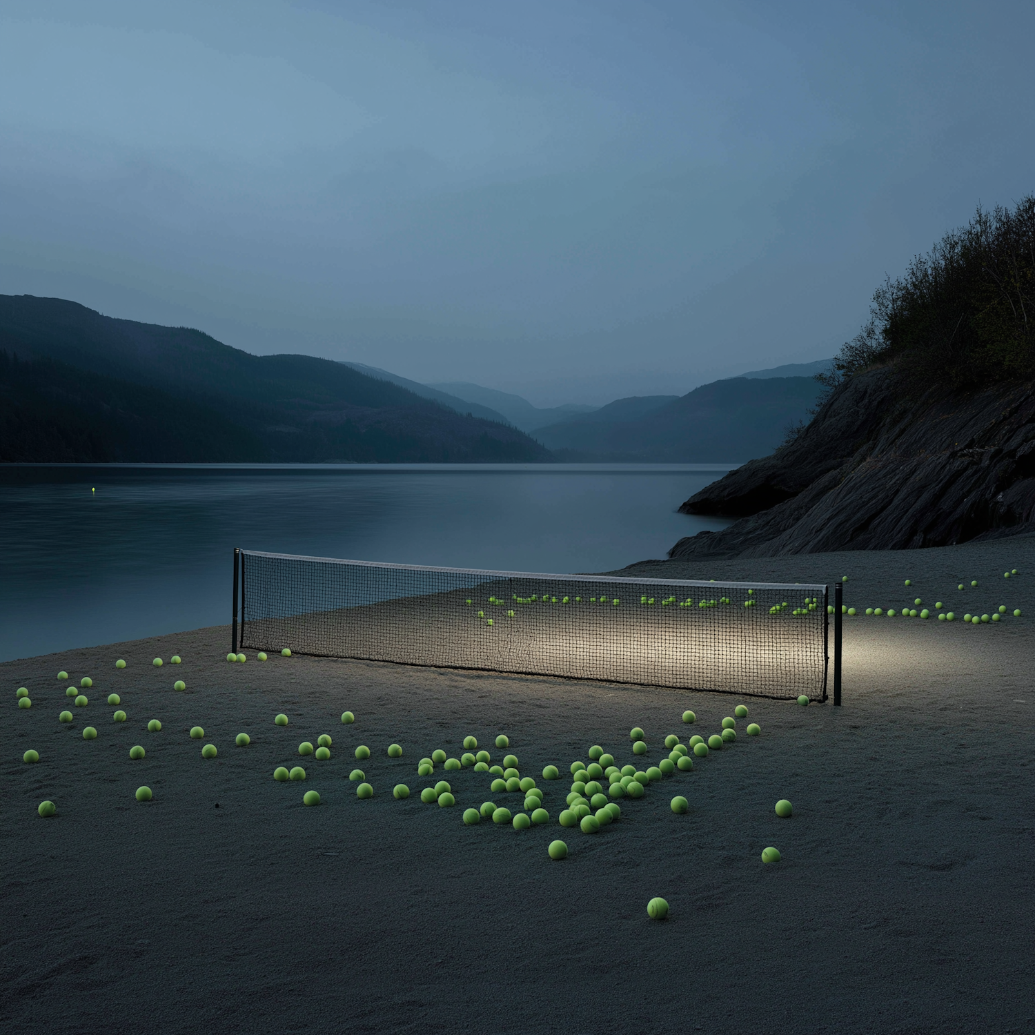 A tennis net on a sandy lakeshore at dusk, surrounded by scattered tennis balls, with a calm lake and hills in the background.