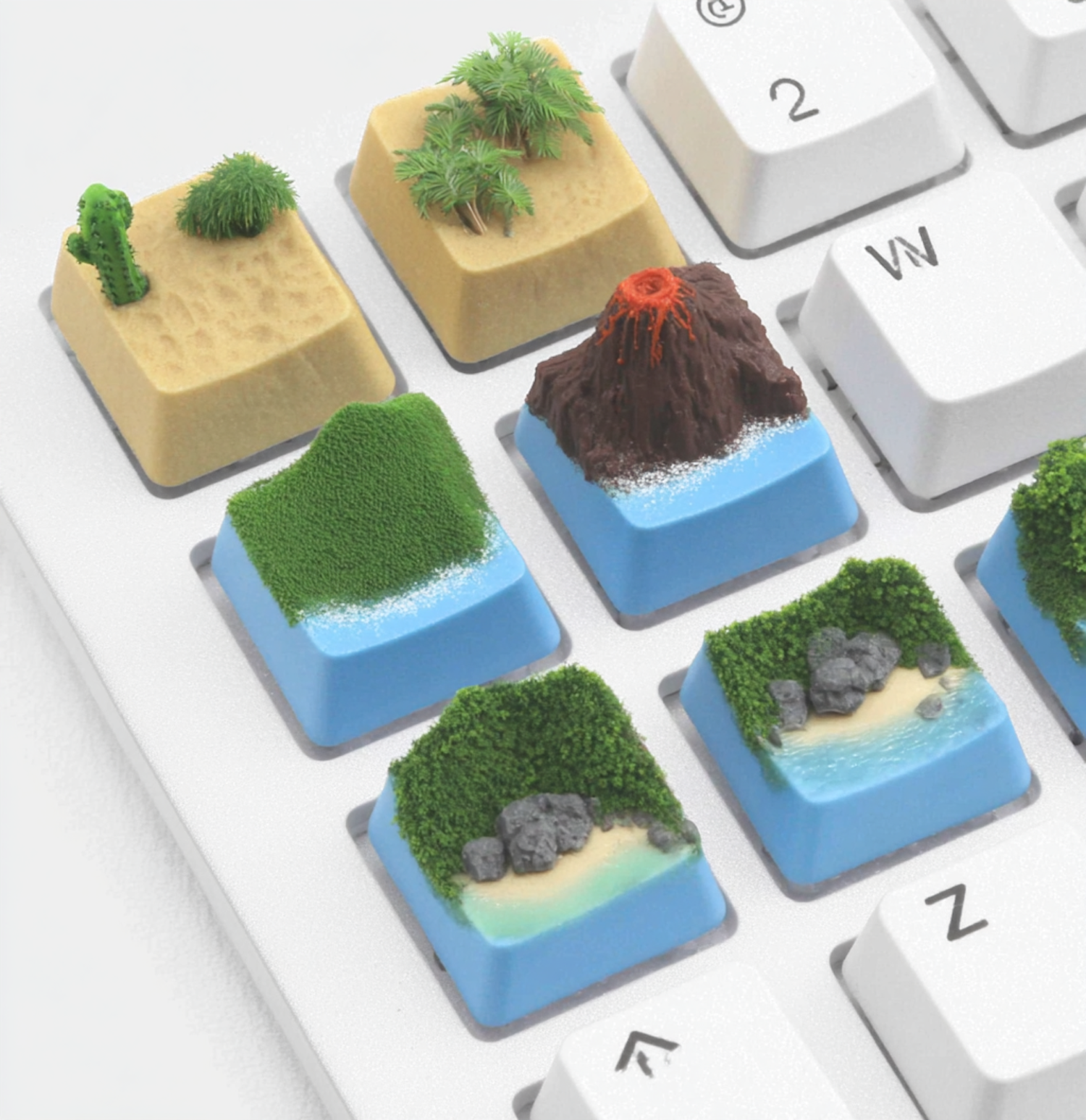 Custom keyboard keycaps designed as miniature landscapes, featuring deserts, volcanoes, and tropical islands, on a white keyboard.